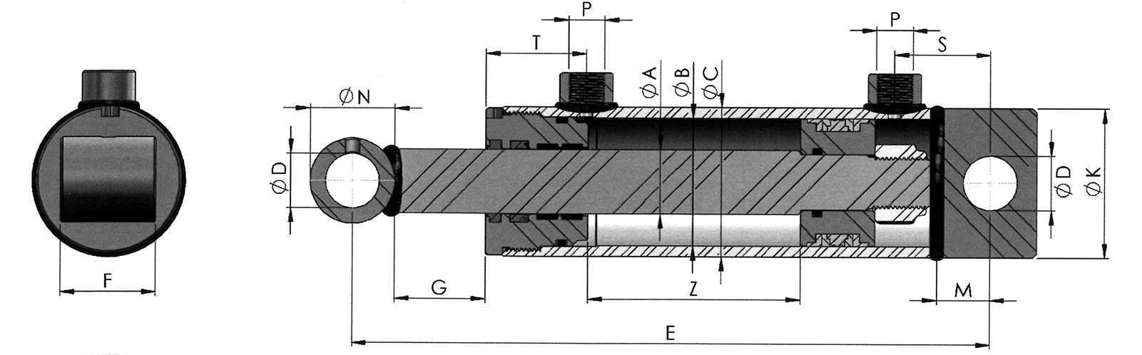 SAUGUT Hydraulikzylinder doppeltwirkend mit Querbohrung und Querbuchse Ø25,5 mm, Kolben-Ø B=60 mm, Kolbenstange-Ø A=30 mm