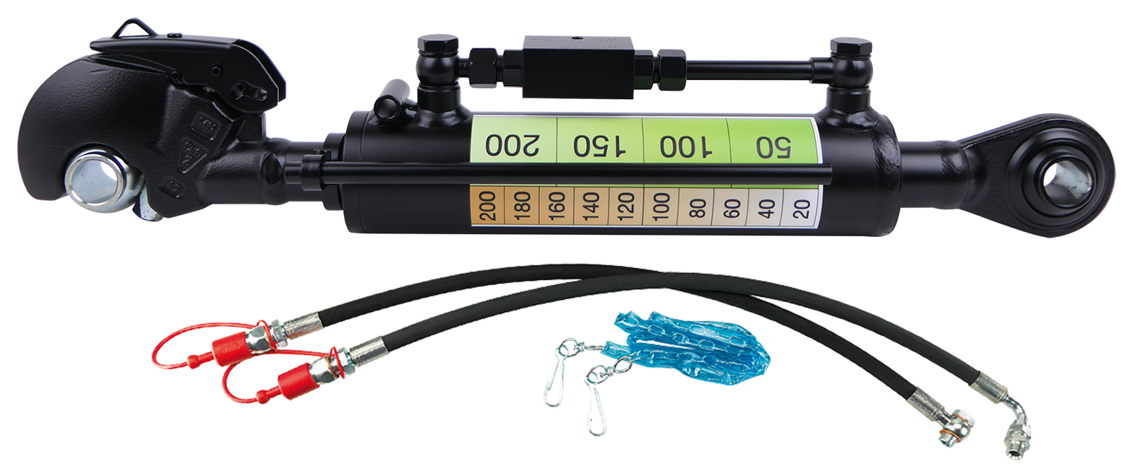 Komplett mit Anschlussschläuchen, Steuerkette für Fanghaken, Oberlenkerkugel und Hubanzeige. Inklusive hydraulisch entsperrbarem Rückschlagventil (Sperrblock).