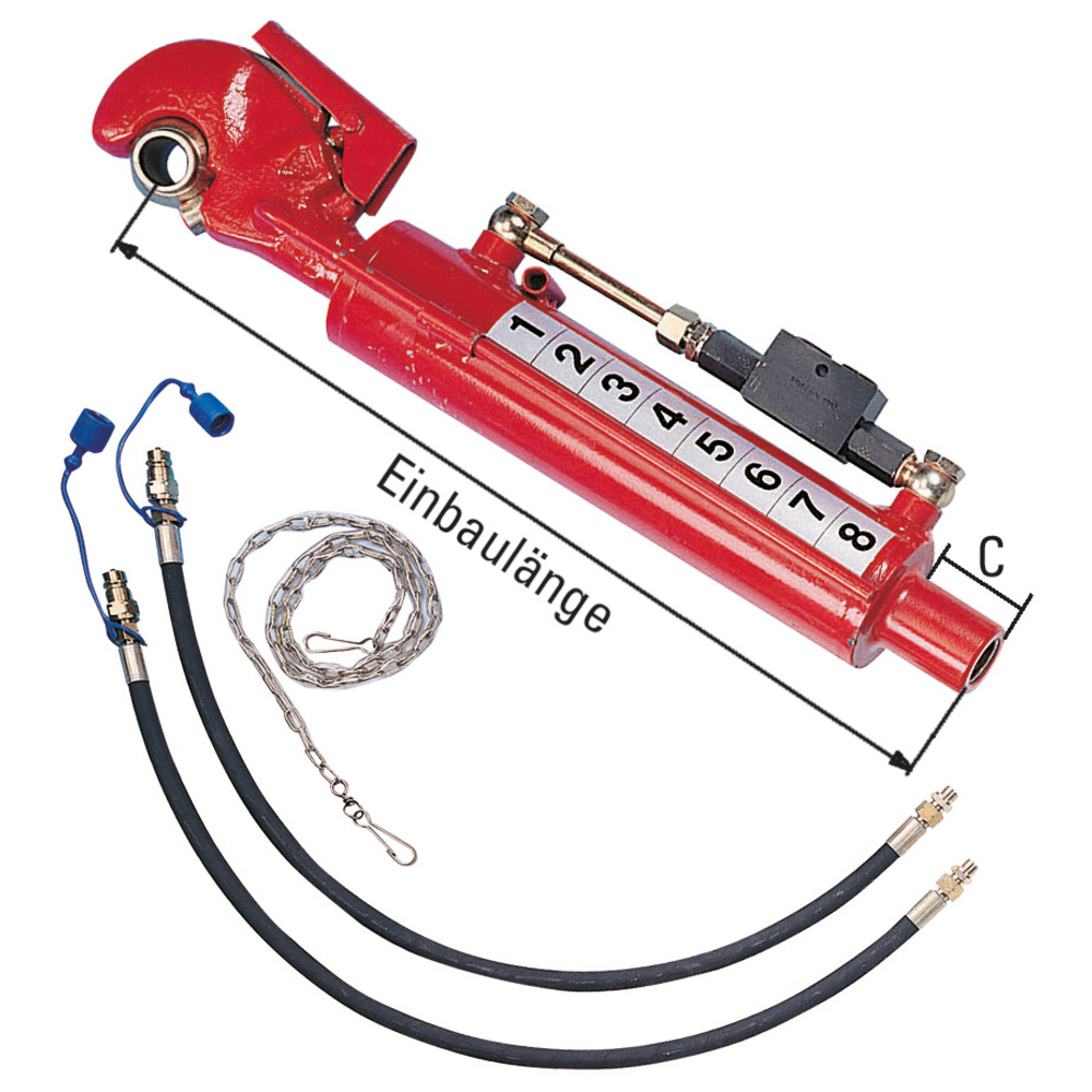 Die Einbaulänge kann über die traktorseitige Befestigung mit einem Gewinde M30 (Kat.2) stufenlos angepasst werden. Lieferumfang: komplett mit Anschlussschläuche inkl. Stecker und Staubschutz, Kette für Fanghaken, Oberlenkerkugel. Inklusive hydraulisch entsperrbarem Rückschlagventil (Sperrblock), ohne Kugelauge oder Schwenklager. Kolben-Ø K = 70 mm, Kolbenstange-Ø S = 35 mm, bis ca. 100 PS, Druckkraft 6927 kg, Zugkraft 5195 kg.