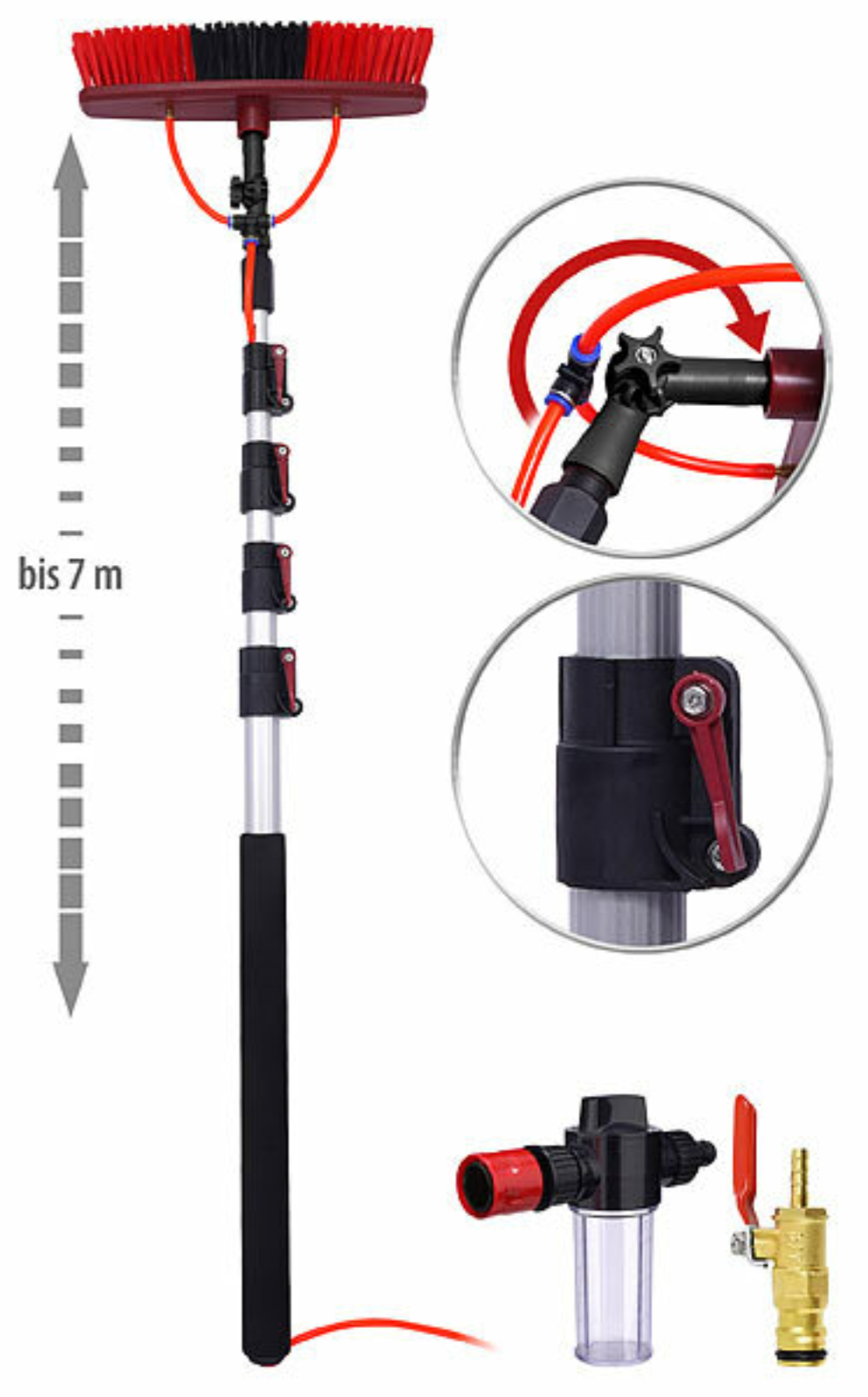 Im Set: Teleskop-Waschbürste inklusive Bürste, Teleskopstiel, Schlauch, Reinigungsmittel-Tank, Schlauch-Kupplung und deutscher Anleitung - Teleskopreiniger - Außerdem relevant oder passend zu: PV, Dach, Stiel, Solar, Besen, Cleaning, Autopflege, Gewächshaus, Telescopstiel, Fensterwischer, Gartenschlauch, Hochdruckreiniger