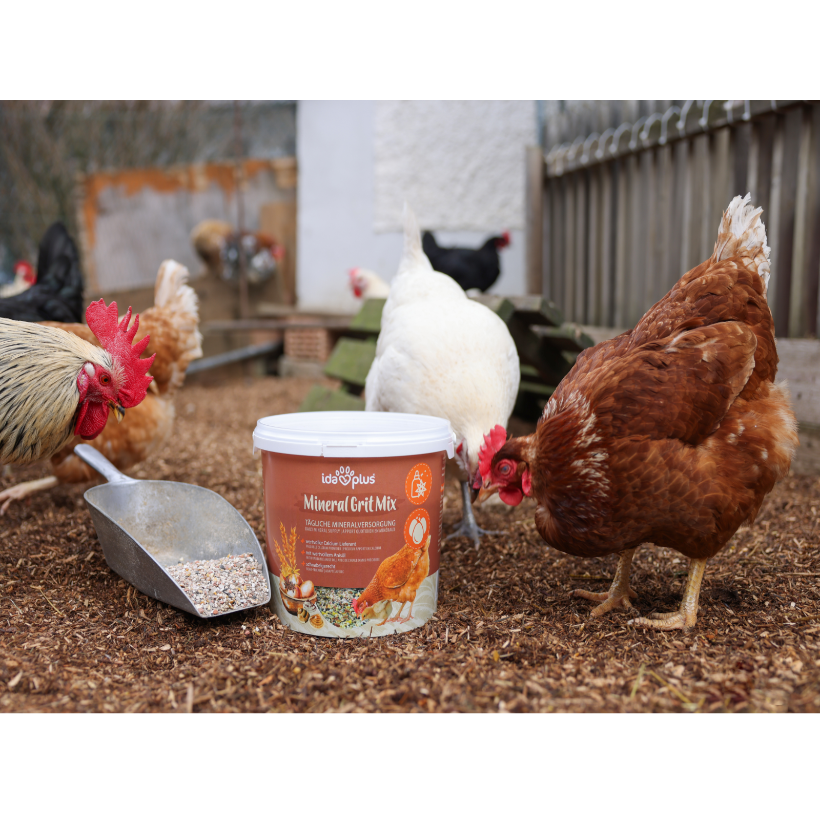 Dem Futter täglich 10 g je Huhn beimischen oder in separaten Futterschalen zur Verfügung stellen