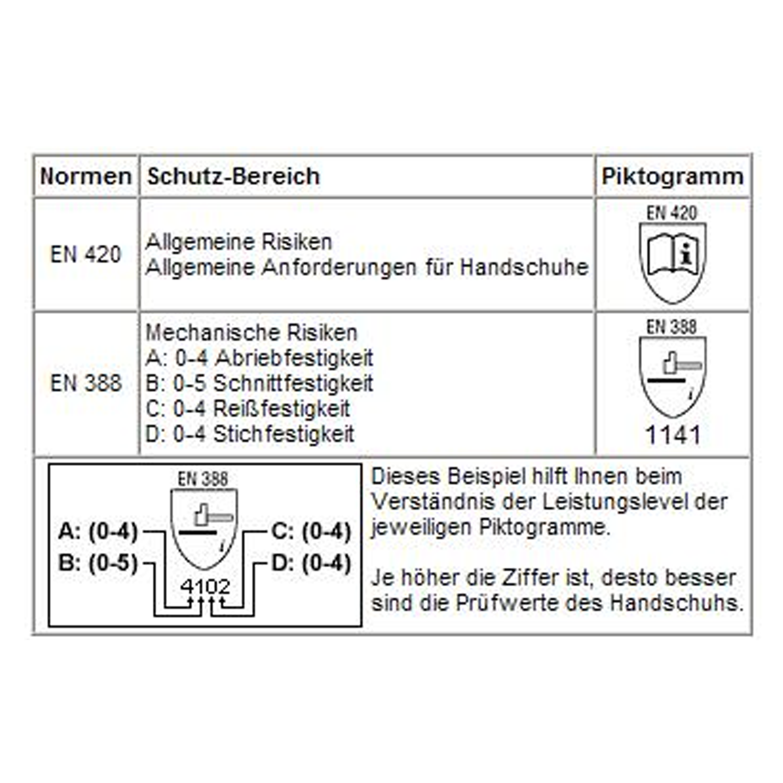 EN 388 ... Angabe der 4 Leistungsstufen des Schutzhandschuhes