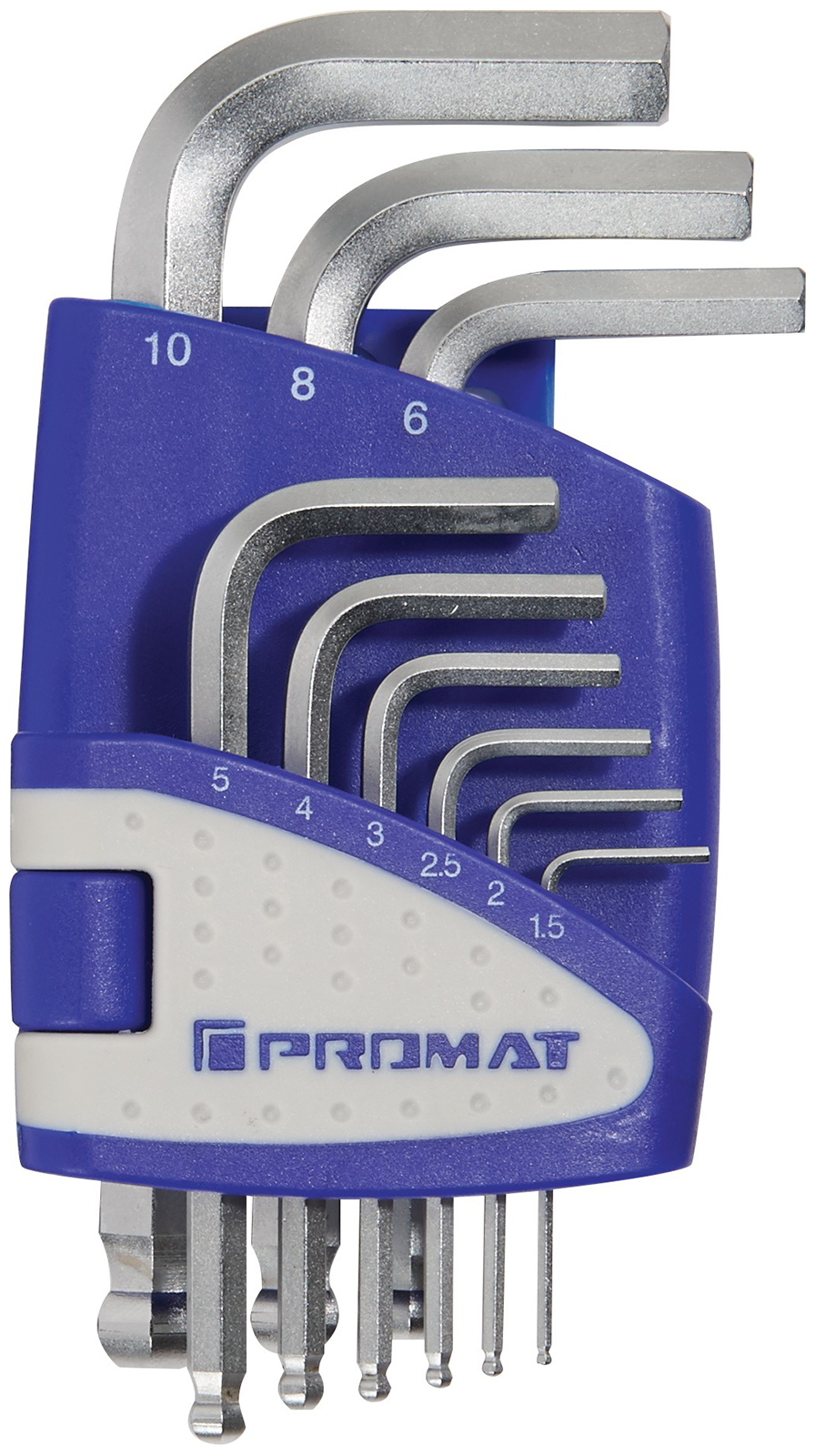 Inbusschlüssel-Satz kurz mit Kugelkof, S2-Stahl, mattverchromt, abgewinkelt, langer Schenkel mit Kugelkopf ermöglicht das Schrauben bis zu einem Winkel von 25°, kurzer Schenkel gefast ·Weitere technische EigenschaftenBestückung: SW 1,5 - 10 mm