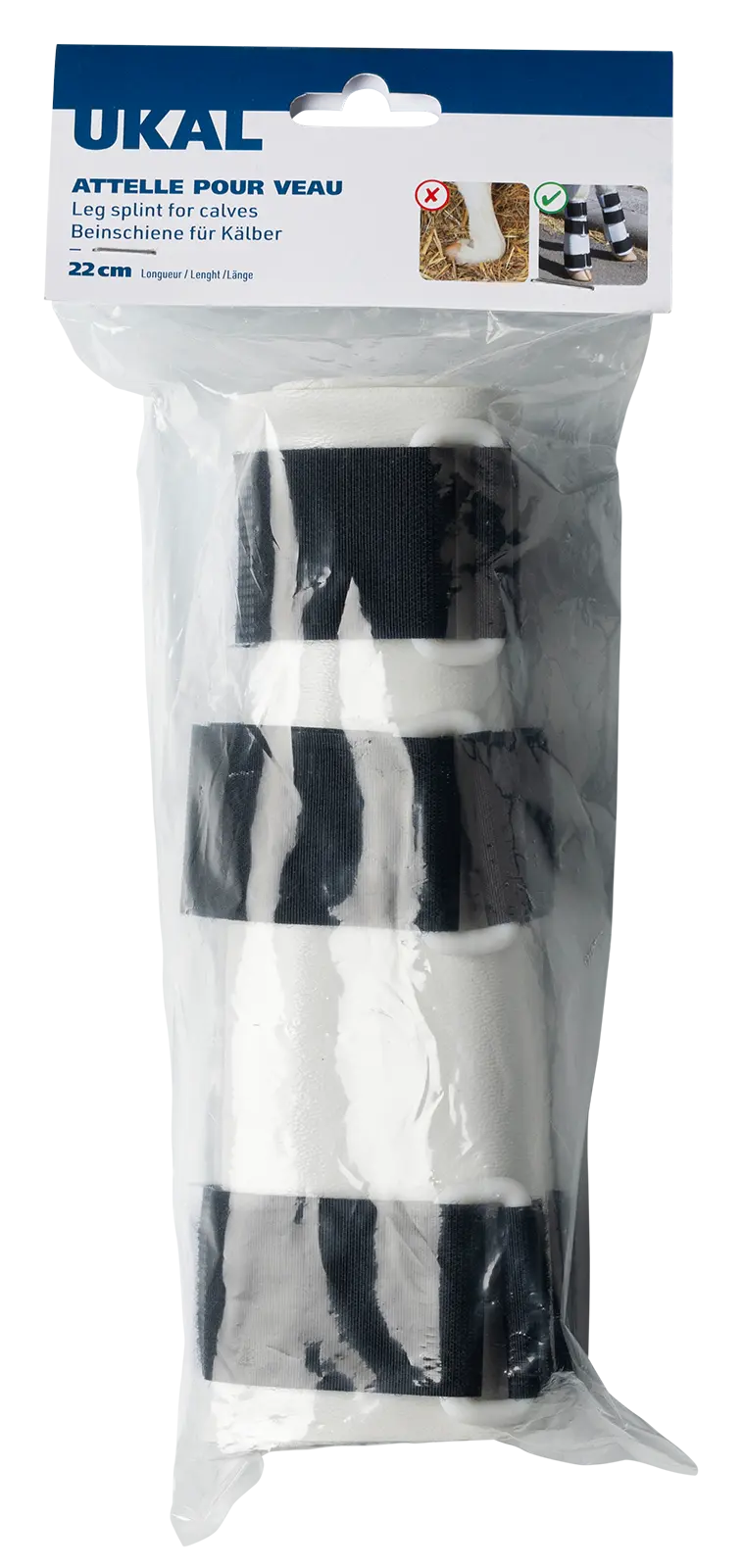 Beinschiene für Kälber mit Sehnenstelzfuß. Ermöglicht gerades Stehen und freie Bewegung. Aus waschbarem ABS-Kunststoff mit Polsterung. Wiederverwendbar. Länge: 20 cm, Gewicht: 70 g.
