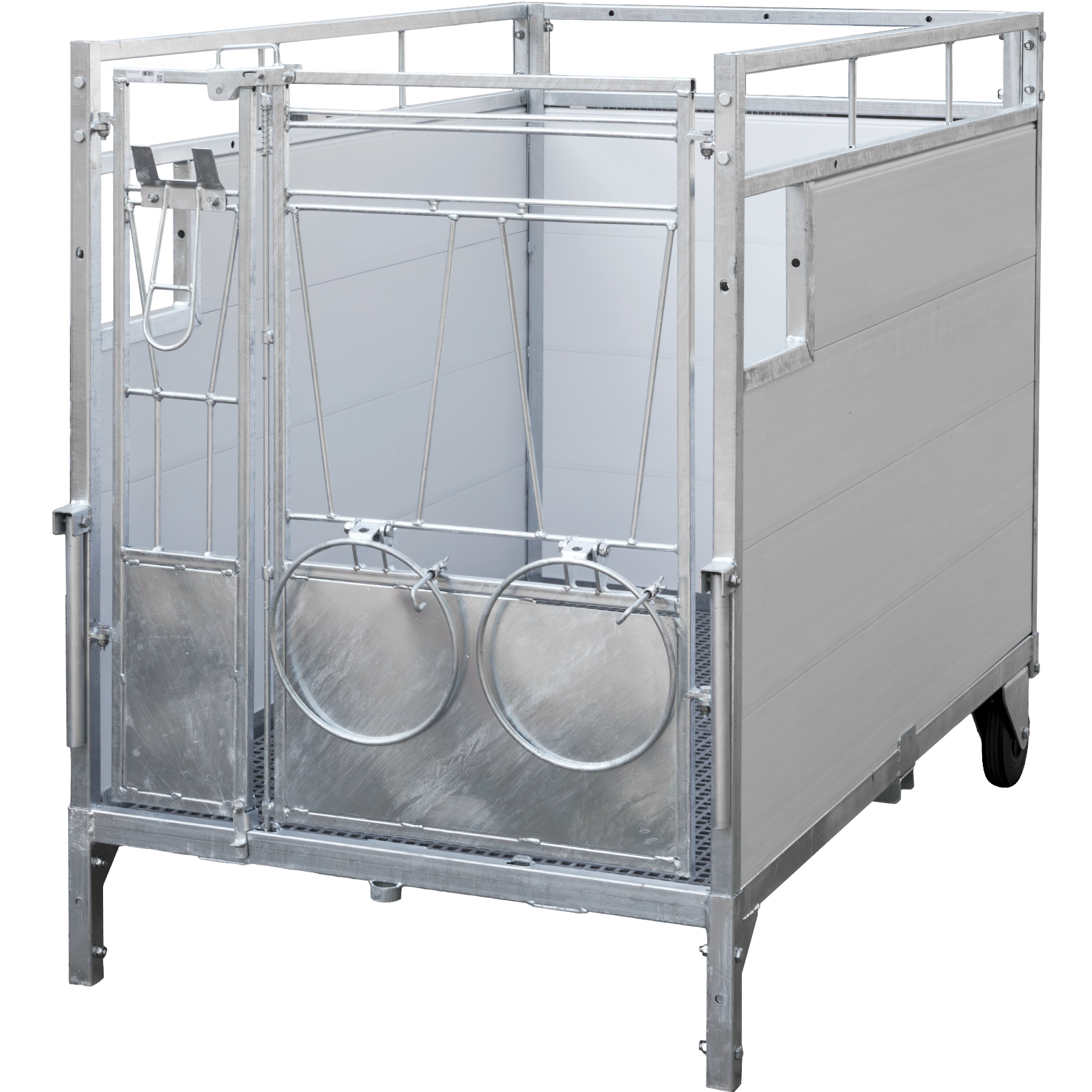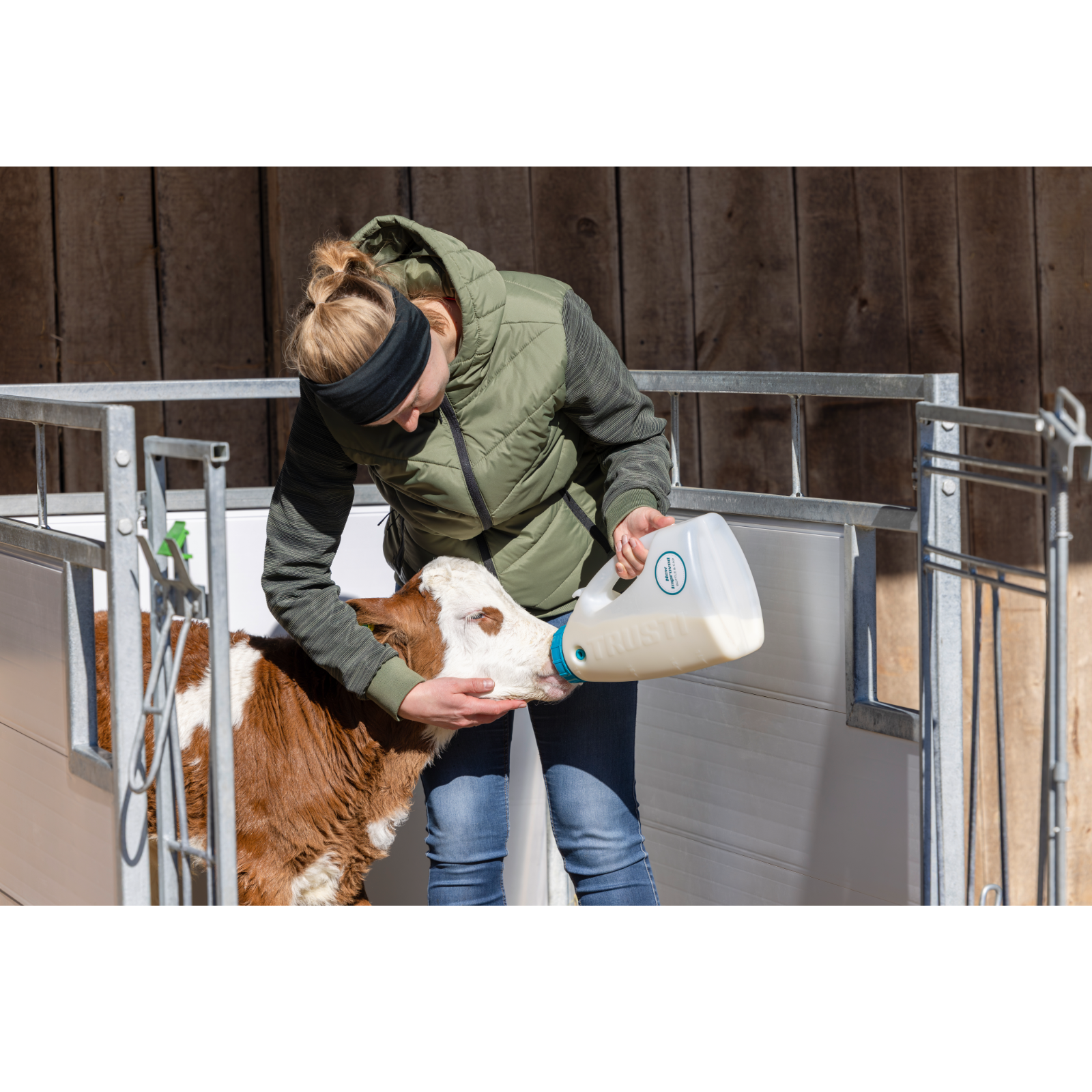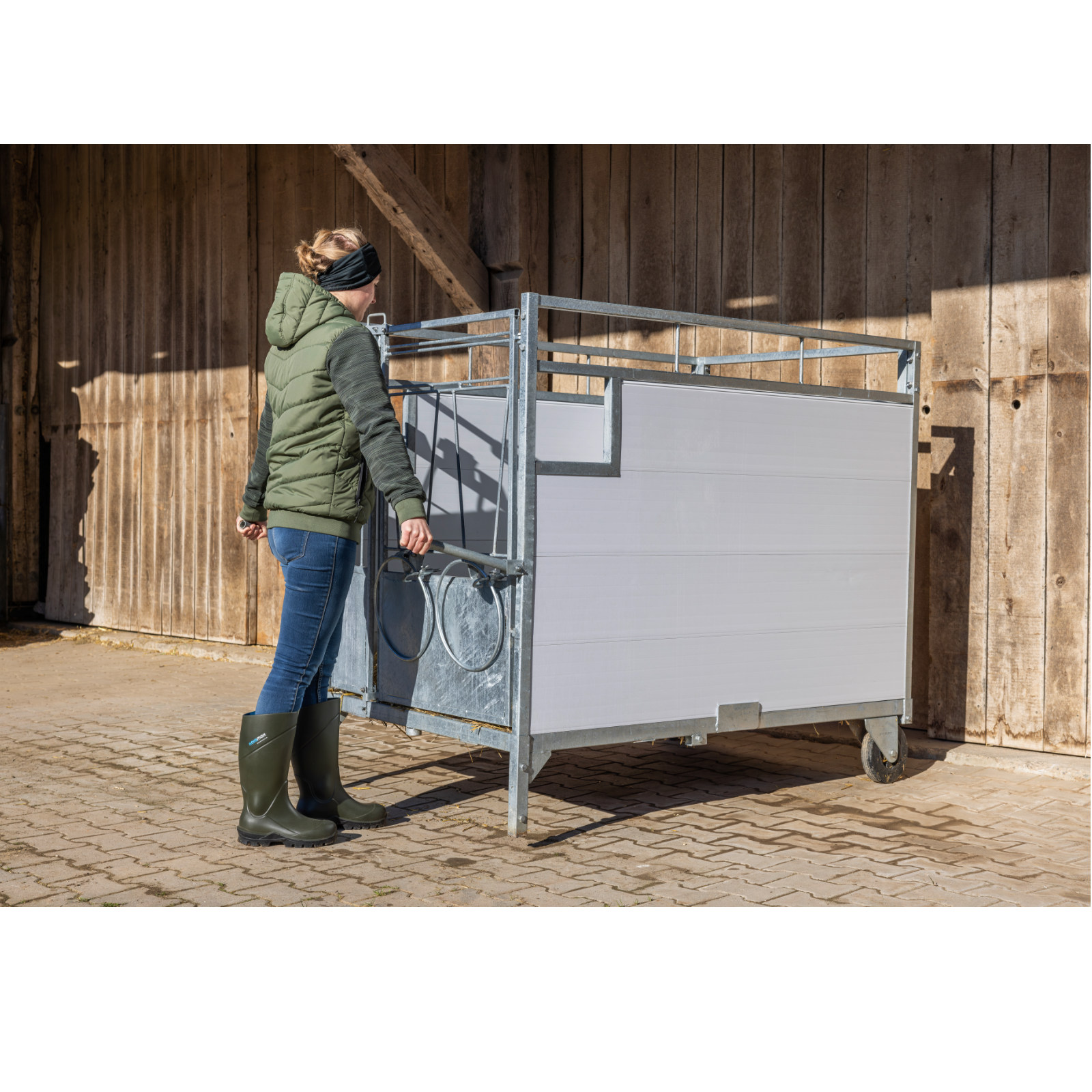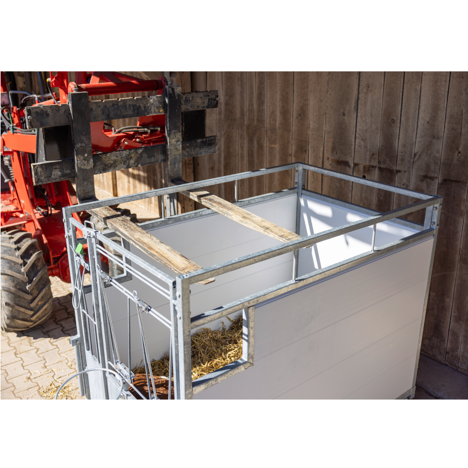 - der offene Spalt im oberen Bereich der Seitenwände ermöglicht dem Kalb denBlickkontaktzu den Nachbarn