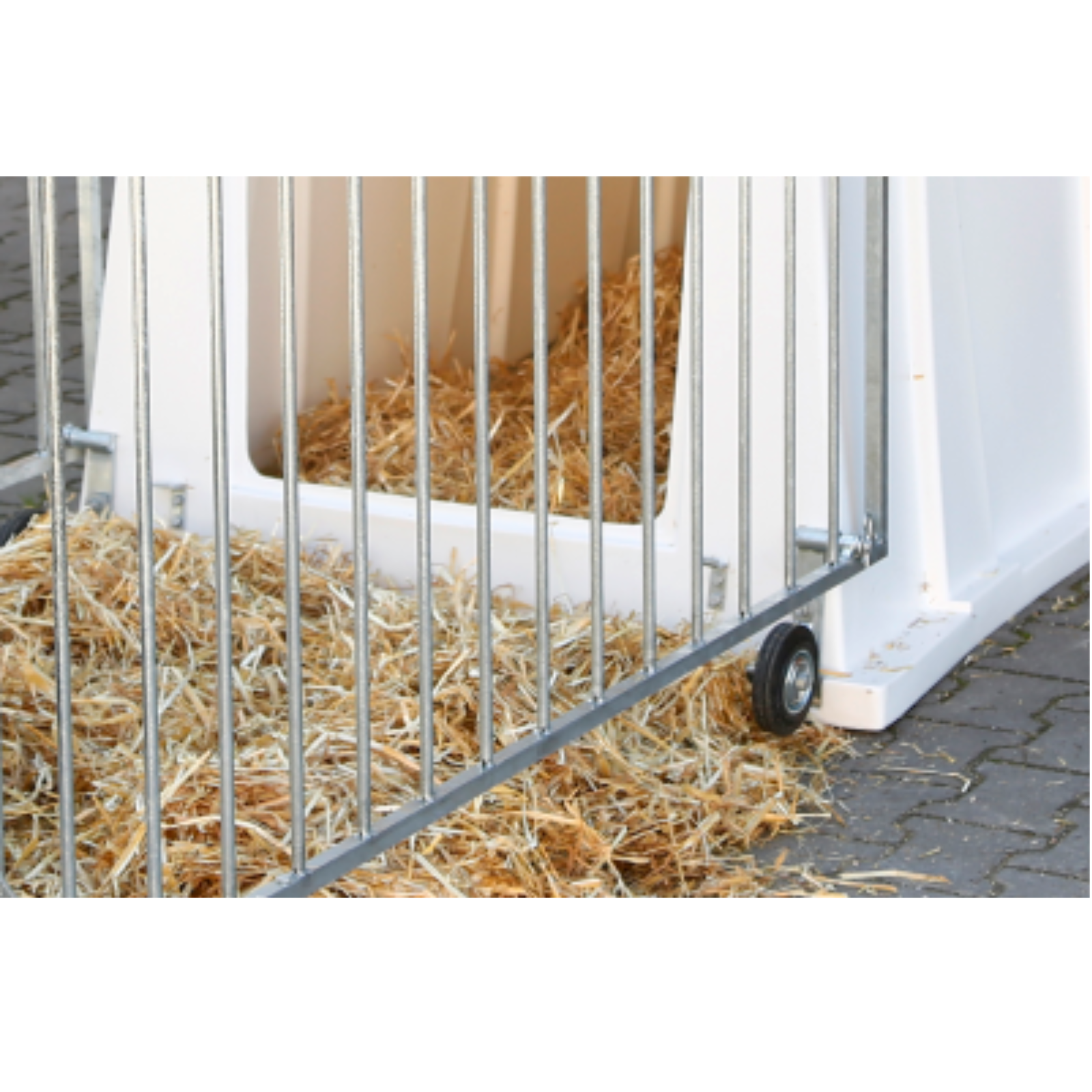 Robust, hygienisch, optimal klimatisiertMaterial: Schlagfester HDPE-Kunststoff, UV-stabilisiert, langlebigStabilität: Stahlrohre verstärken die BodenschwelleKlimatisierung: Einstellbare Belüftungsklappe, ansteigende Dachschrägen für Luftzirkulation, weiße Oberflächen gegen ÜberhitzungHygiene: Glatte Innenflächen, leicht zu reinigenMaße: Hütte 205 x 115 x 135 cm, Umzäunung 150 x 110 x 96 cm (ca. 30 kg)Hinweis: Eimer, Futterbox und Heuraufe nicht enthalten