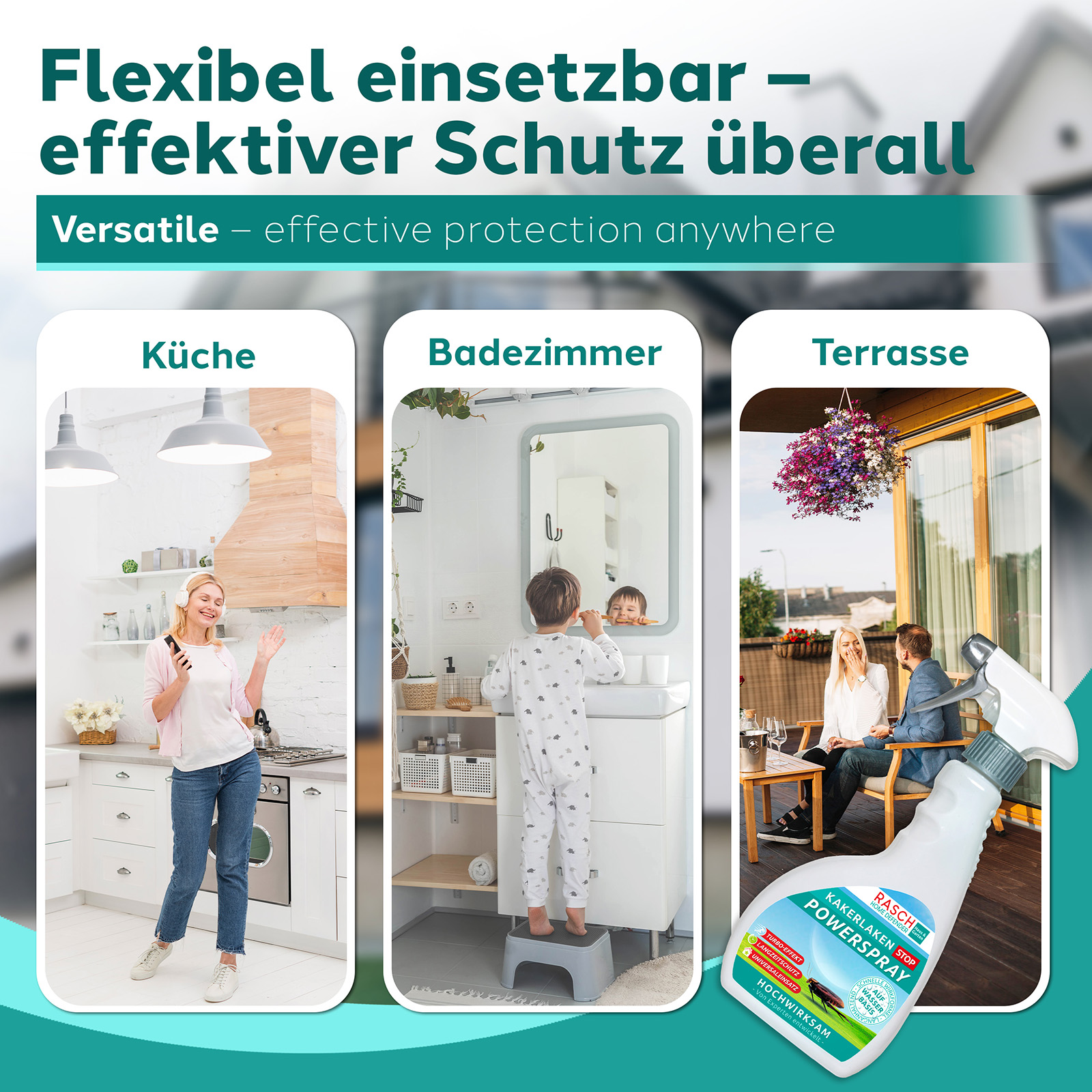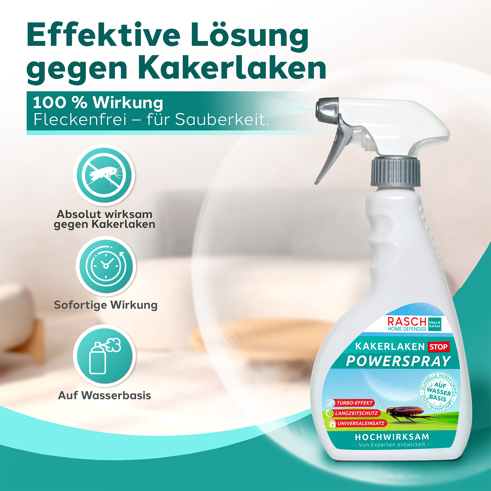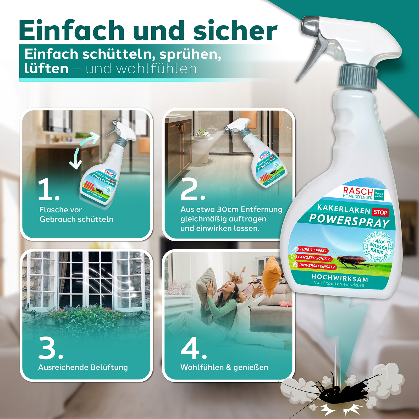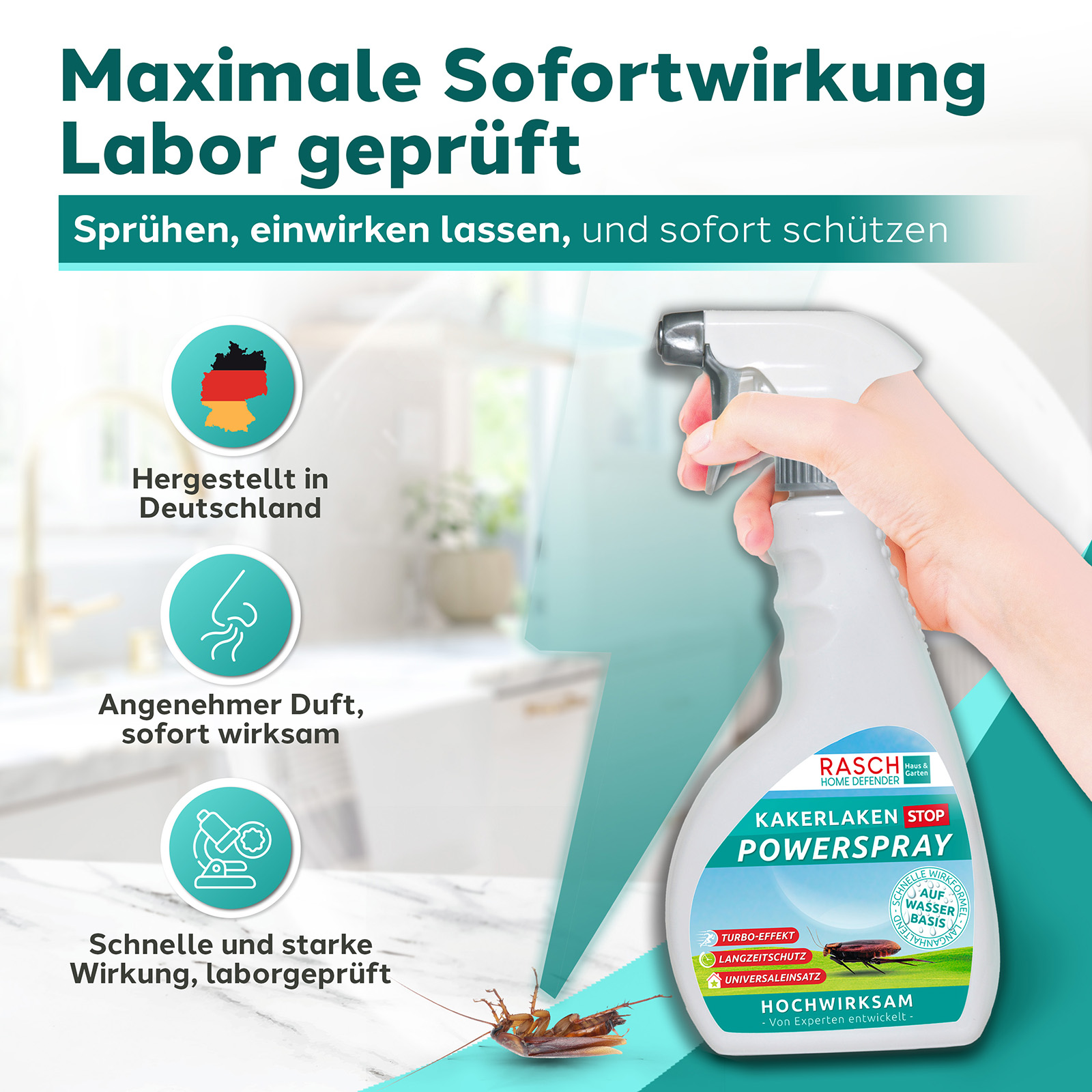 Bietet eine wirksame Kakerlaken-Vergrämung auf sichere Weise. Wirksam auch gegen andere kriechende Insekten wie Ameisen und Silberfischchen. Nach dem Sprühen bleibt das Kakerlaken-Spray 4-6 Wochen lang wirksam, um sicherzustellen, dass Kakerlaken und anderes Ungeziefer fernbleiben. Sprayflasche 500 ml.Hinweis: Biozidprodukte vorsichtig verwenden. Vor Gebrauch stets Etikett und Produktinformationen lesen. BauA-Reg.-Nr.: N-115085.