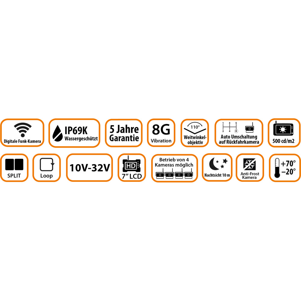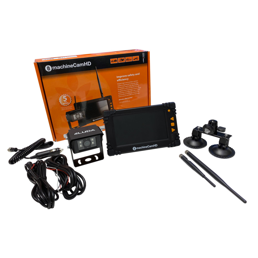 Die MachineCam Mobility HD ist ein mobiles und digitales Funk-Kamerasystem für alle Ihre Fahrzeuge und Maschinen. Dieses System besteht aus einer digitalen drahtlosen Funk-Kamera mit Magnethalterung (40 kg Haftkraft), einem Monitor und einem aufladbarem Powerbank-Akku (mit Magnethalterung) für die Stromversorgung der Kamera. Die Kamera hat die Wasserschutzklasse IP 69K und Nachtsichtfunktion (ca. 10 Meter), überträgt drahtlos auf eine Entfernung von bis zu 100 Metern scharfe, hochauflösende und störungsfreie HD Videobilder auf den mitgelieferten großen 7“ Monitor. An den Monitor kann man bis zu 2 Kameras anschließen. Die Kamera hat Normalbild/Spiegelbildfunktion und Sie können Rangierlinien in den Monitor einblenden. Eine volle Ladung des Powerbank Akku reicht für ca. 15 Stunden Betriebszeit der Kamera. 3 Jahre Garantie bei online Registrierung. Systemtyp 2.4 GHZ wireless Sender/Empfänger Kamera: