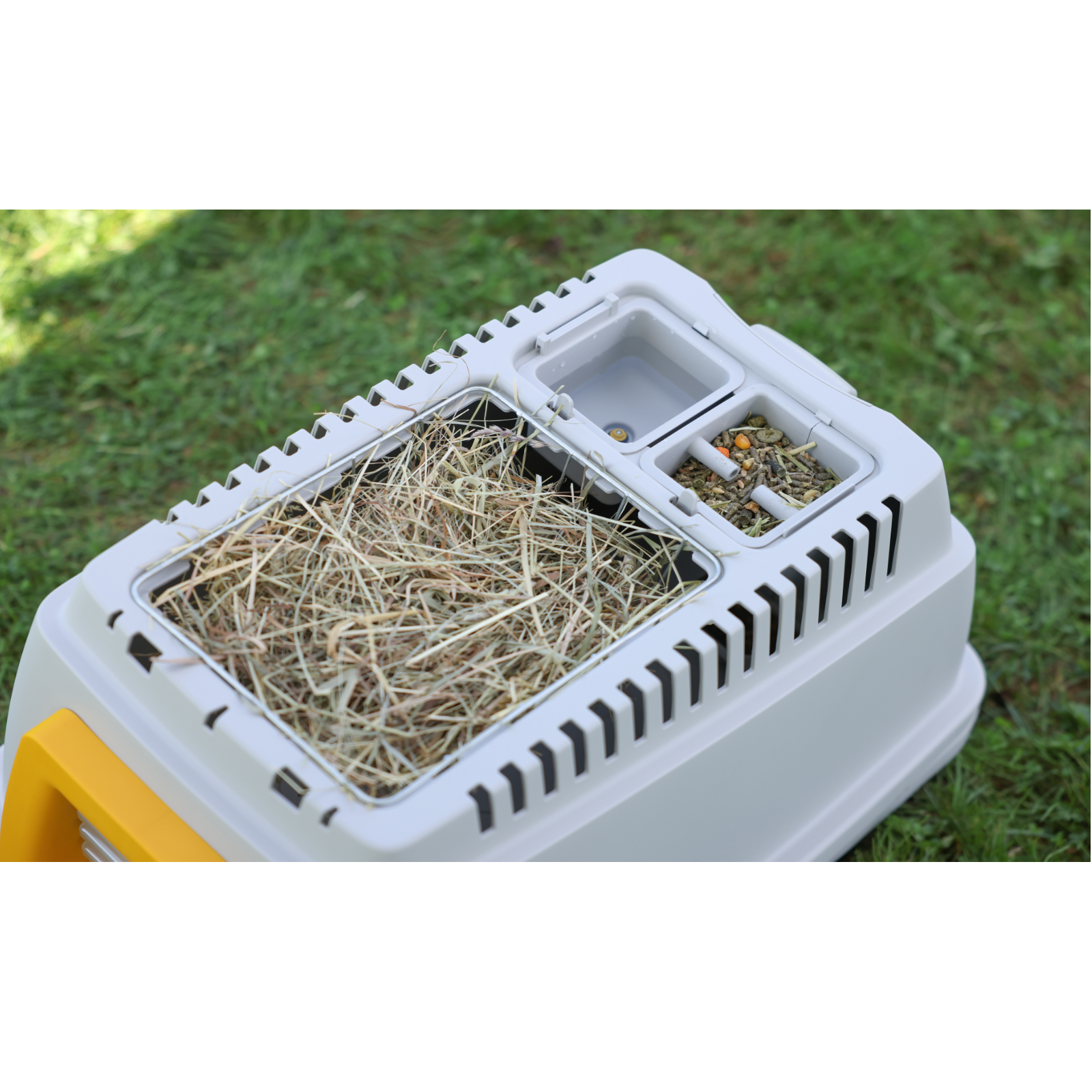 mitintegrierter Heuraufe, Wasser- und Futterspender - so sind die Kaninchen auch mal über einen längeren Zeitraum ausreichend versorgt