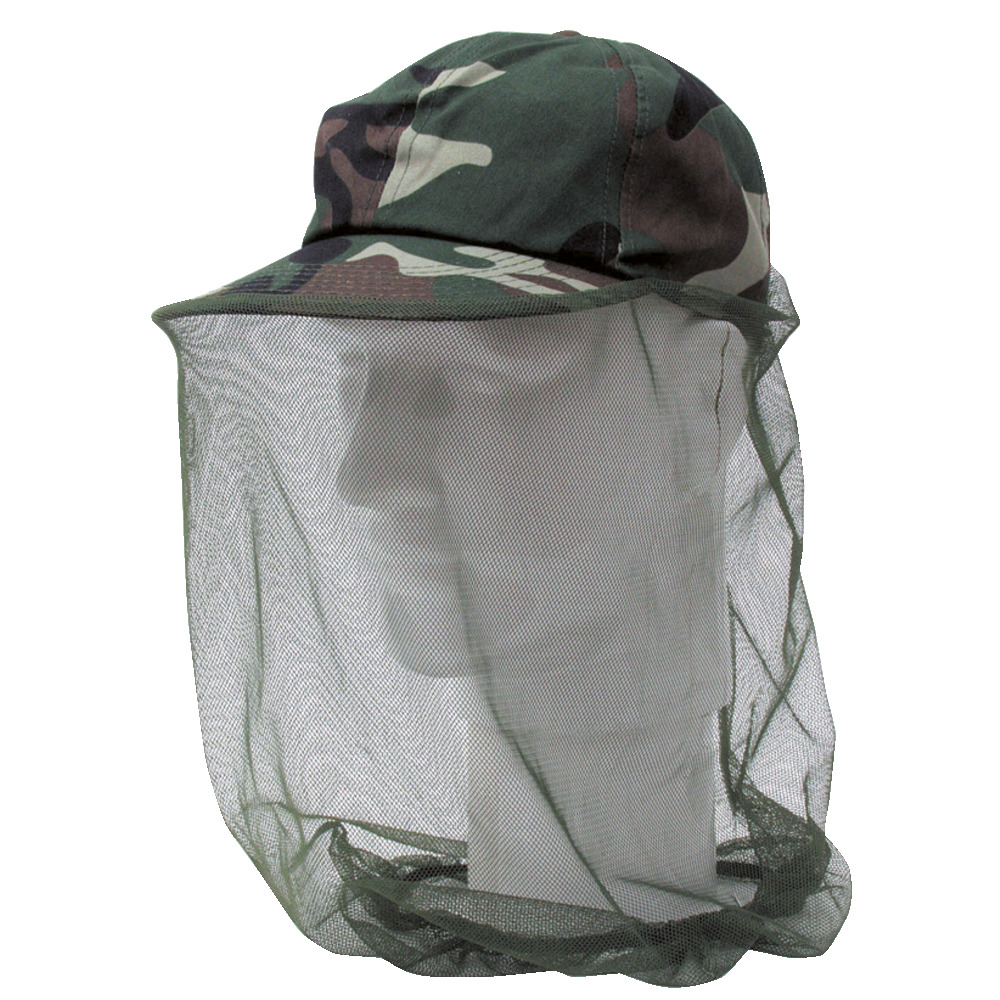 Schirmkappe mit angenähtem Moskito Netz. 20% Nylon, 80% Polyester.