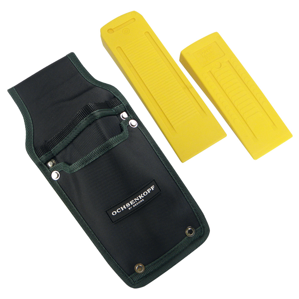 besteht aus gepolsterter Keiltasche und 2 Polyamid Keilen mit den Maßen 180x65 mm (100 g) und 230x70 mm (300 g)
