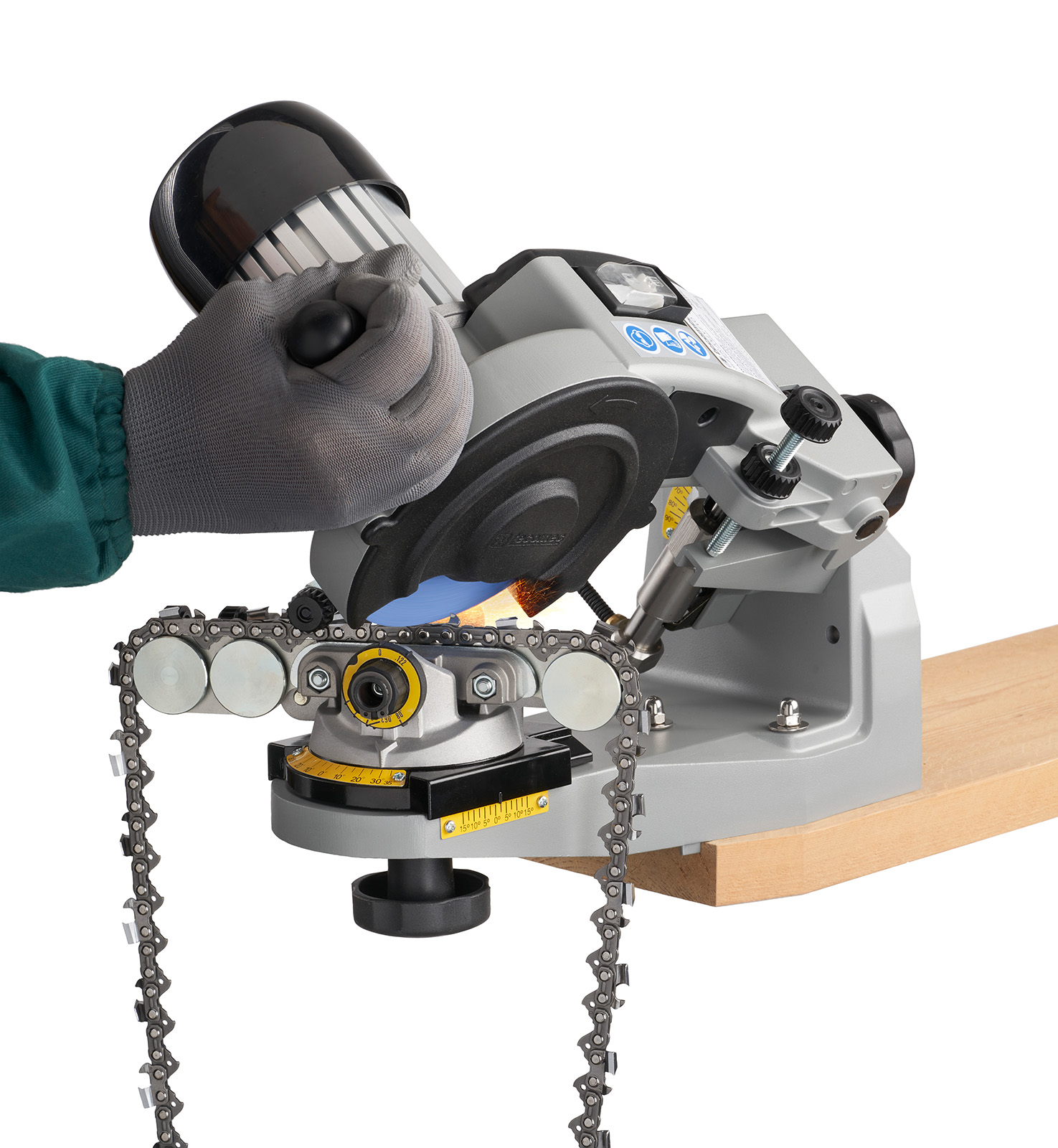 Mit 15 Watt Lampe zur besseren Ausleuchtung beim Schleifen. Für alle gängigen Sägeketten und Tiefenbegrenzer.