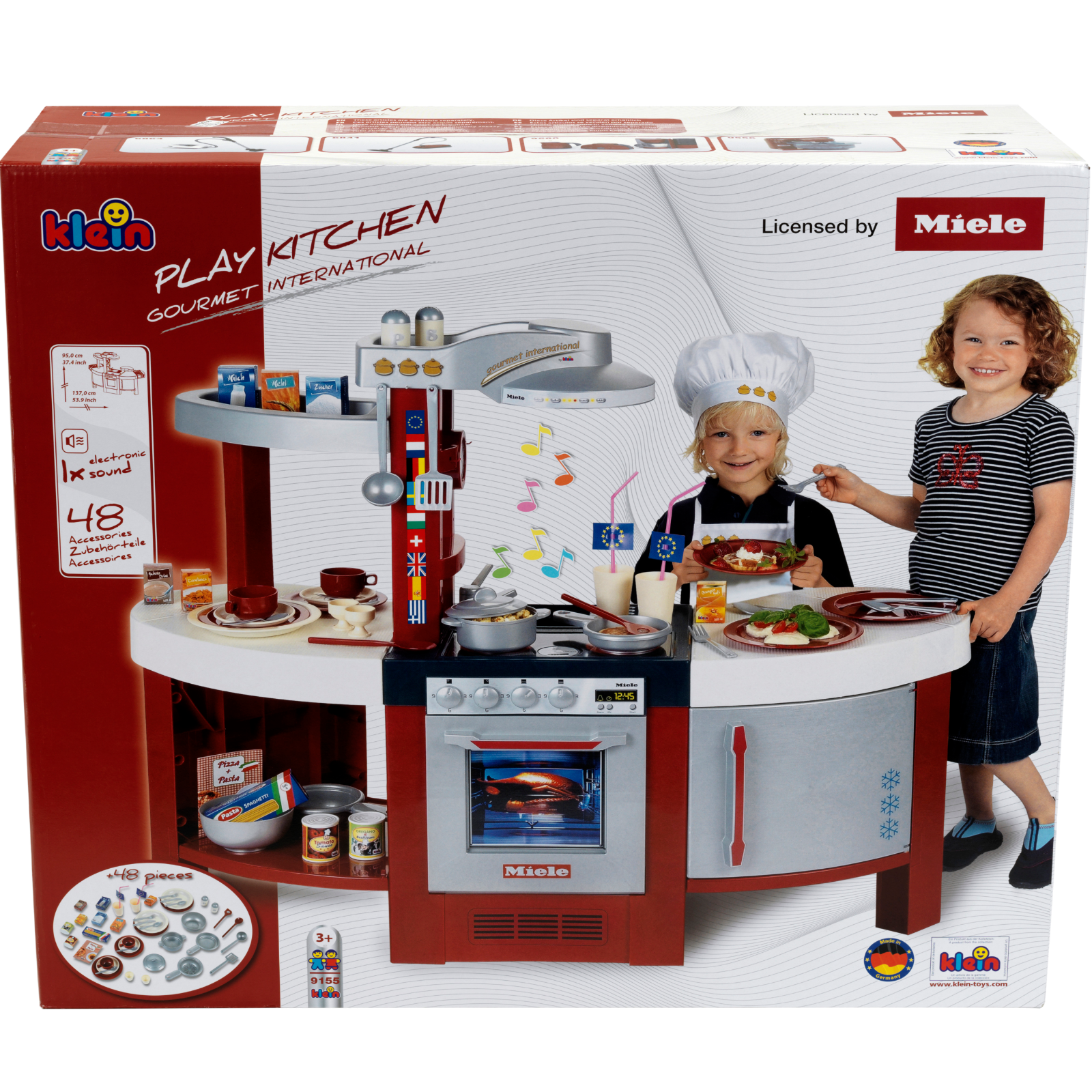 Die Miele Küche Gourmet International macht aus dem Kinderzimmer einen Gourmet-Tempel! Dank der stattlichen Maße von 1,20 Meter Breite, 95 Zentimeter Höhe und 45 Zentimeter Tiefe bietet sie den kleinen Kochprofis einen Ofen, Kochplatten, die in Aktion echte Kochgeräusche machen, einen Kühlschrank, eine Spüle sowie eine Spülmaschine und sogar eine Abzugshaube samt Ablagefläche. Bei so viel Platz ist auch das reiche Zubehör gut und schnell verstaut: Zählt man all die Teller, Becher, das Ess- und Koch-Besteck, Topf, Pfanne, Sieb, Salz- und Pfefferstreuer sowie die Spiellebensmittel zusammen, kommt man auf 40! Jede Menge Spaß und Möglichkeiten für die Kinder, sich als Nachwuchs-Koch und Köchin auszuprobieren!Spielmöglichkeiten: Herdplatte mit Soundmodul, Ofen, Geschirrspüler, Abzugshaube, Spülbecken, Kühlschrank, Ablagefächer und Schrank.Zubehör: Pfanne, Topf mit Deckel, Schüssel, Sieb und Kochgeschirr wie Pfannenwender, Schöpfkelle und zwei Kochlöffel, ein Frühstücks (Teller, Tasse, Untertasse, Kaffeelöffel und Eierbecher) und Ess-Set für zwei Personen (Teller, Suppenteller, Gabel, Messer, Löffel und Becher mit Strohhalm mit Fahne) sowie Salz- und Pfefferstreuer, zwei Bonduelle-Dosen und sieben Lebensmittelschachteln.- Made in Germany- Maße: 120 cm x 95 cm x 43 cm- Geeignet für Kinder ab drei Jahren- Benötigte Batterien 2 x RO3 AAA - Nicht im Lieferumfang enthaltenDiese vollausgestattete Kinderküche lässt keine Wünsche offen und ist der Hingucker in jedem KinderzimmerSie enthält eine Kochplatte mit Sound, Ofen, Spülmaschine- und becken, sowie Kochzubehör und ein Besteckset für 2 PersonenAuf der Kochplatte lässt es sich lecker kochen, mit dem Geschirr hübsch servieren und im Spülbecken alles wieder sauber machenDie Spielküche lässt sich von vielen Seiten bespielen, ist hochwertig verarbeitet, robust und bietet Kindern viel Raum für Fantasie und KreativitätMade in Germany I Maße: 120 cm x 95 cm x 43 cm I Geeignet für Kinder ab drei Jahren I Benötigte Batterien 2 x RO3 AAA - Nicht im Lieferumfang enthalten