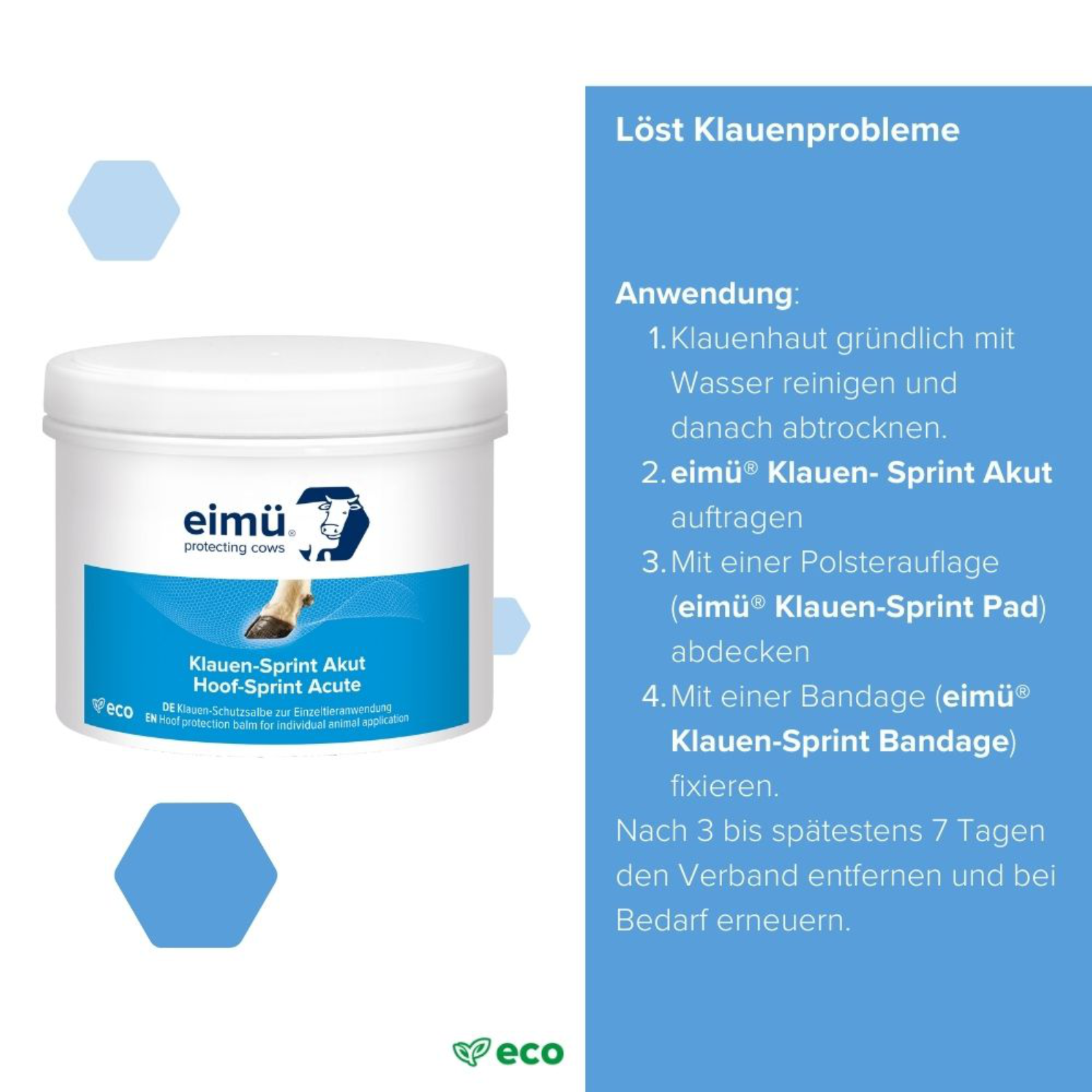 eimü Klauen-Sprint Akut gezielt auftragen, mit einer Polsterauflage (eimü Klauen- Sprint Pad) abdecken und mit einer Bandage (eimü Klauen-Sprint Bandage) fixieren