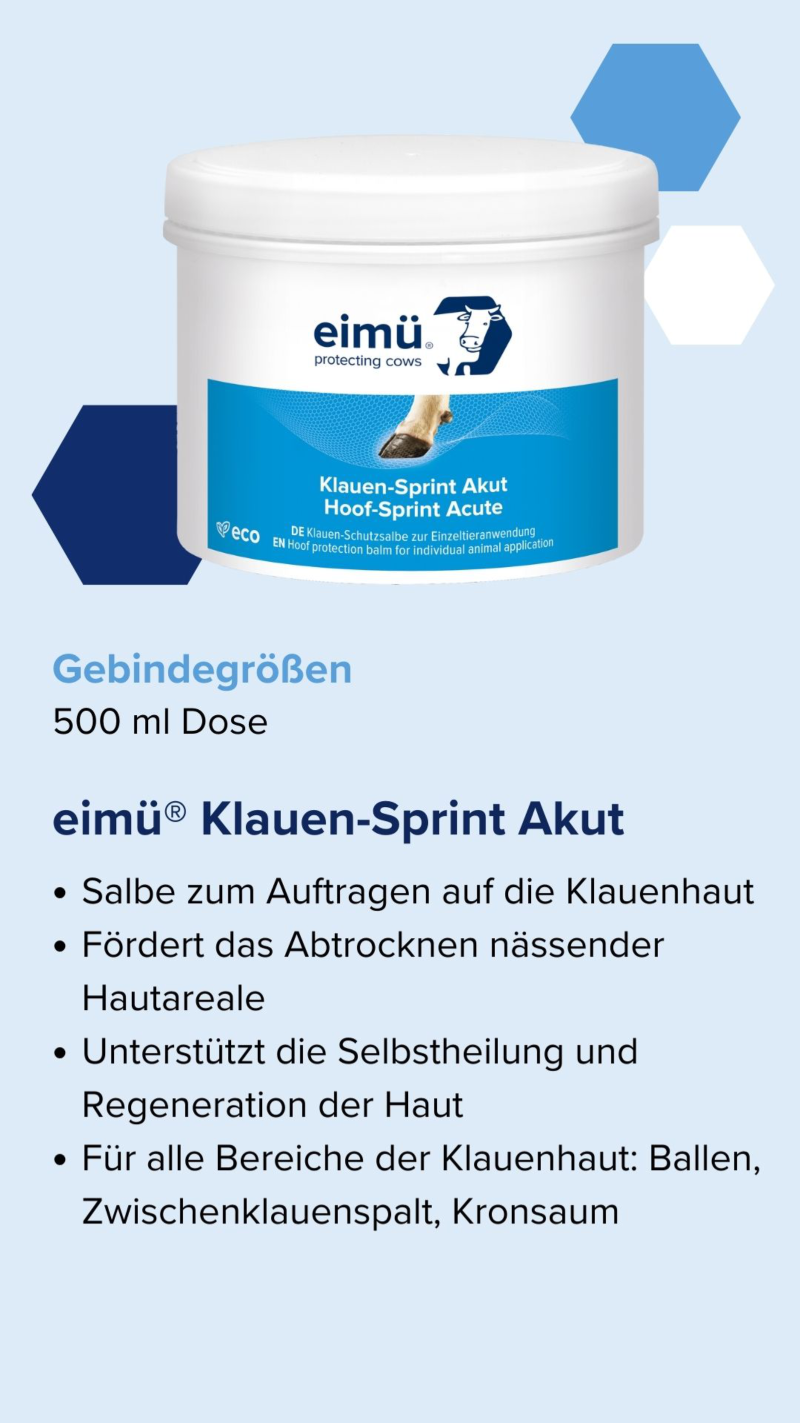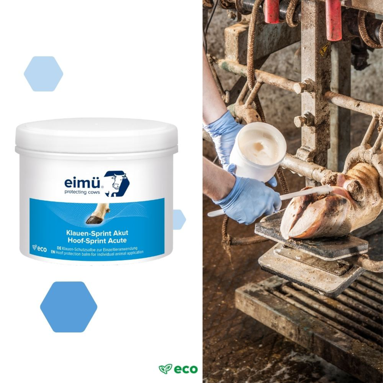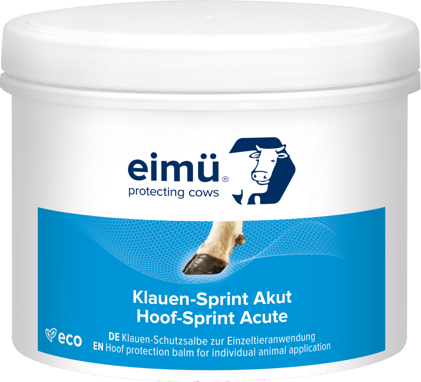eimü Klauen-Sprint Akut ist eine hocheffektive Salbe zum nachhaltigen Schutz der Klauengesundheit. Gerade in der intensiven Laufstallhaltung von Kühen und Jungrindern sind Klauenerkrankungen wie Dermatitis digitalis ein häufiges Problem. Durch das gezielte Auftragen im Ballenbereich wird die Selbstheilung gefördert und eine schnelle Regenration erreicht. Die einfache Anwendung als Klauenverband mit eimü Klauen-Sprint Pad und eimü Klauen-Sprint Bandage sichert den Erfolg der Anwendung. Dose 500 ml