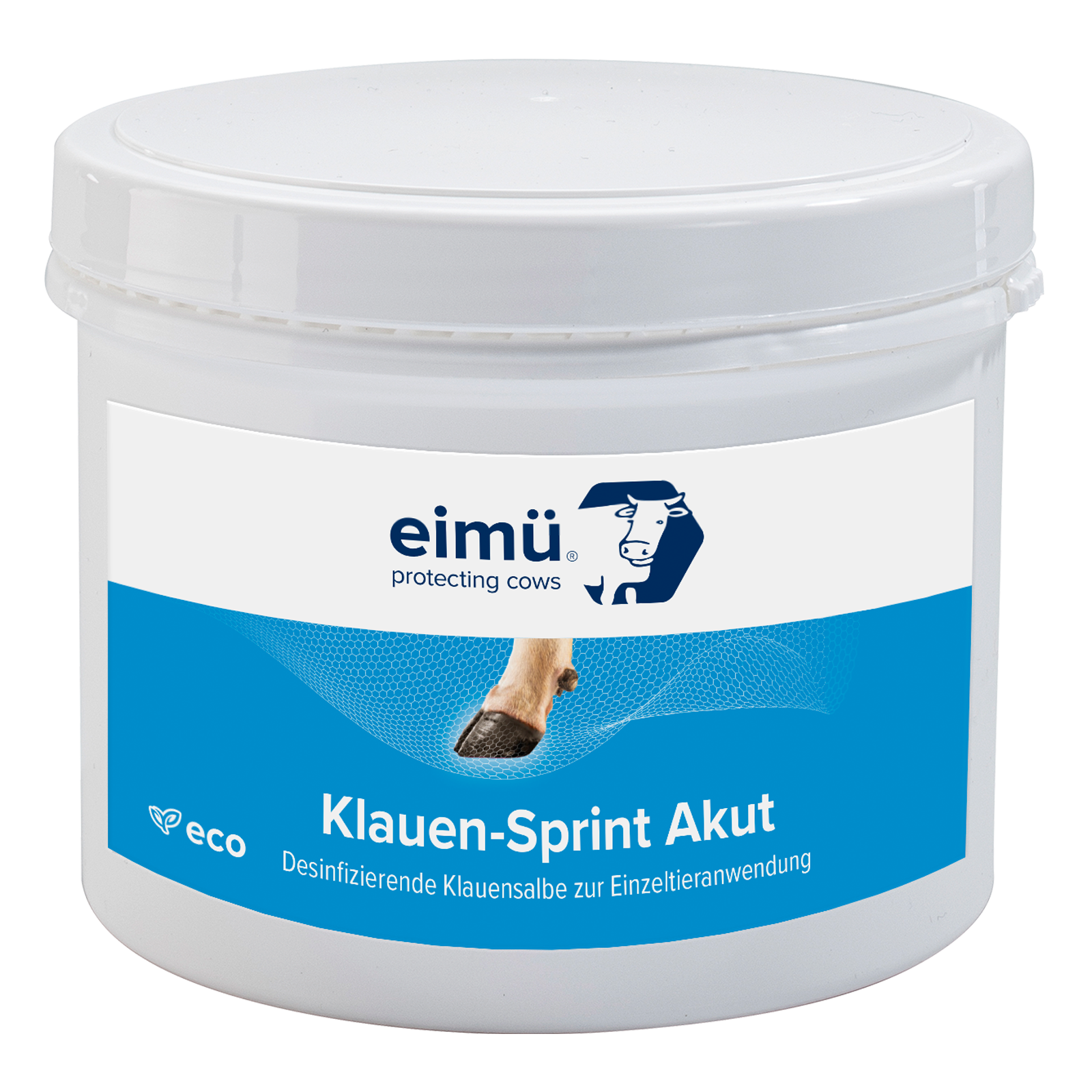 Ergänzt die Klauen-Hautpflege am Einzeltier. Wenn Einzeltiere offene Hautstellen oder Läsionen zeigen, muss eine individuelle Versorgung stattfinden. Hierbei begleitet eimü® Klauen-Sprint® Akut-Salbe, indem sie wasserfest die betroffenen Hautpartien abdeckt, vor Schmutz und Keimen schützt und die Therapie bzw. natürliche Heilung ideal begleitet.