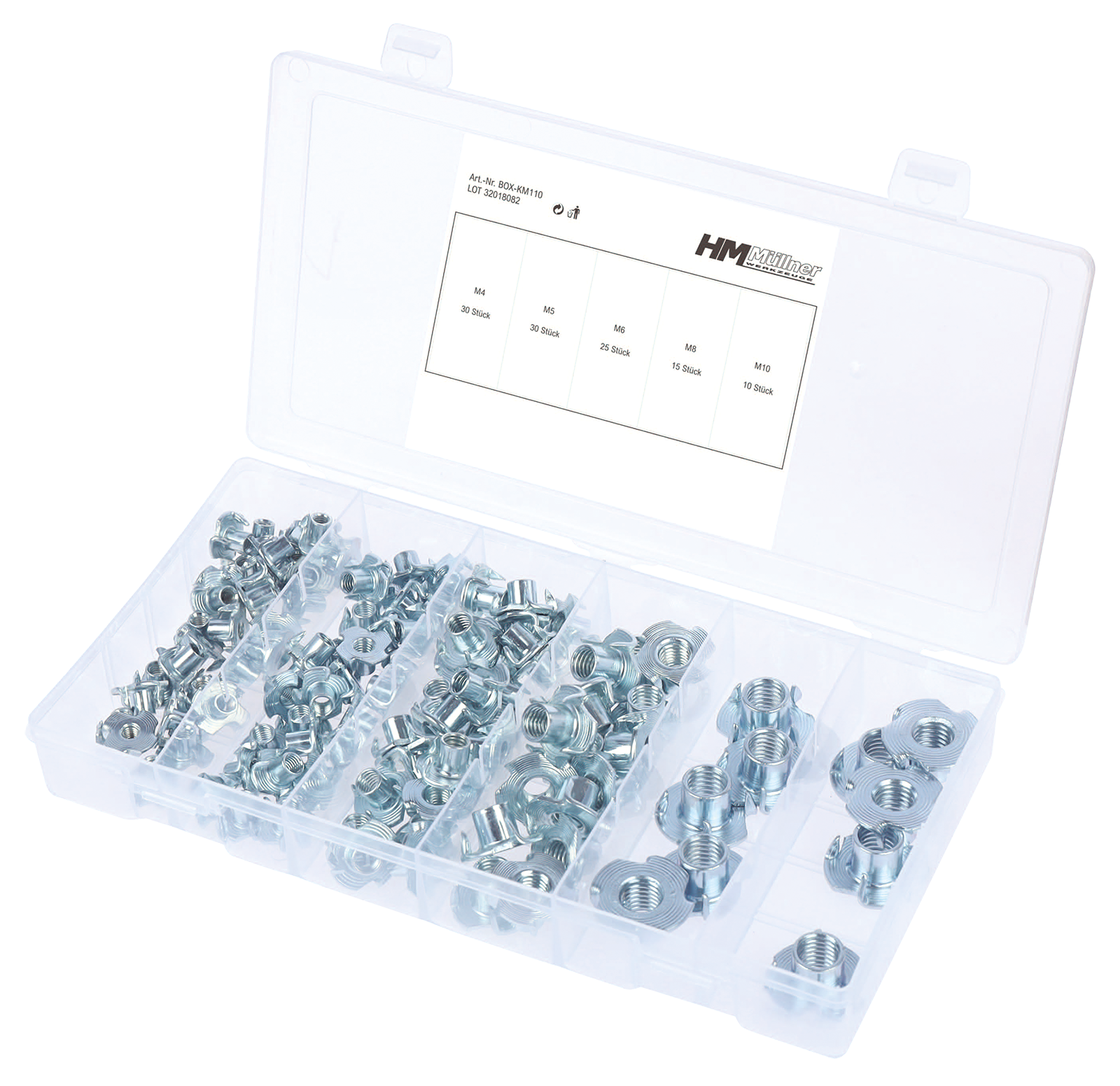 Klauen-Einschlagmuttern-Sortiment 110-tlg in PVC-Kassette. aus galvanisch verzinktem Stahlmit 4 Klauen, 5 Größen von M4-M10 für Verankerungen mit Holz.