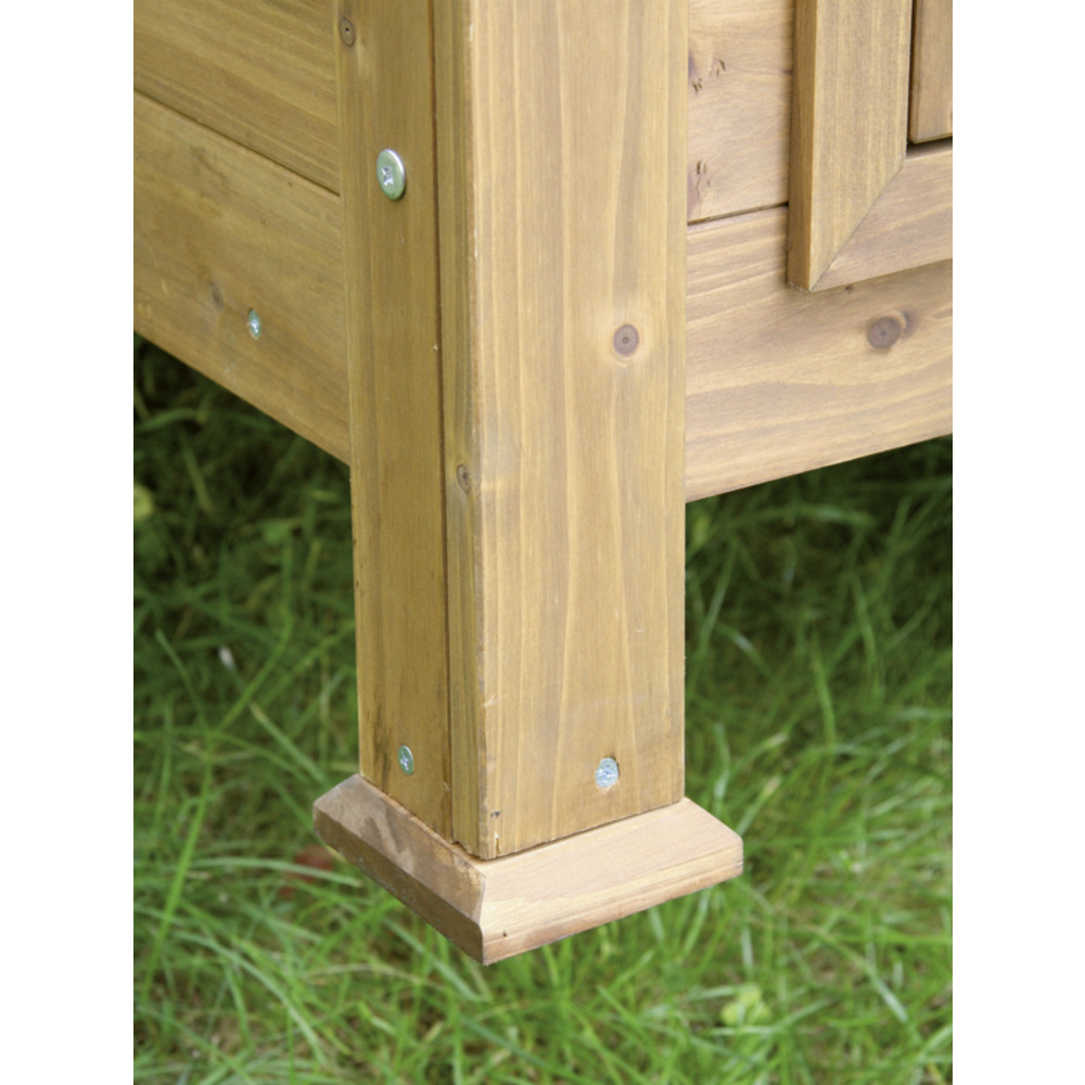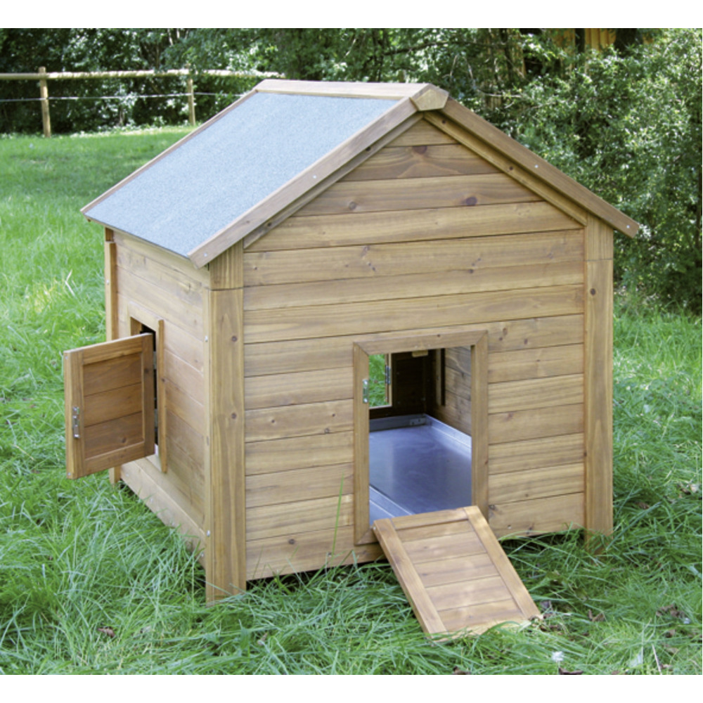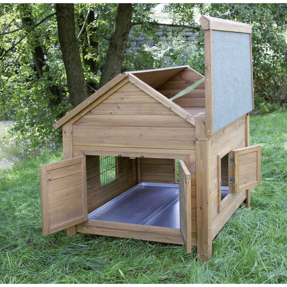 Kleintierstall mit wetterbeständigem Bitumendach. Das Dach ist zu öffnen, mit Zwischenboden zum Verstauen von Kleinteilen. Mit Holzschutzfarbe lasiert, verlängerte Füße ermöglichen eine bessere Bodendurchlüftung. Verzinkte Wannen erleichtern das Reinigen des Stalles.Das Freilaufgehege (69930) ist anbaubar. Umrüstsatz zur Verwendung als Hühnerstall optional erhältlich (Legenest Best.Nr. 69929). Ohne Legenest ist es ideal für Hasen, Kaninchen oder Meerschweinchen geeignet.Lieferung erfolgt zerlegt im Karton, inkl. Aufbauanleitung, einfache MontageMaße: (L x B x H) 105x100x108cmUm die Lebensdauer des Stalles zu verlängern, sollten Sie das Holz mit geeignetem Anstrich nachbehandeln.Der beste Standplatz ist unter einem Vordach an der Wetter abgewandten Seite.Mit Legenest geeignet für ca. 7 Legehennen (lokale Tierschutzbestimmungen beachten!)