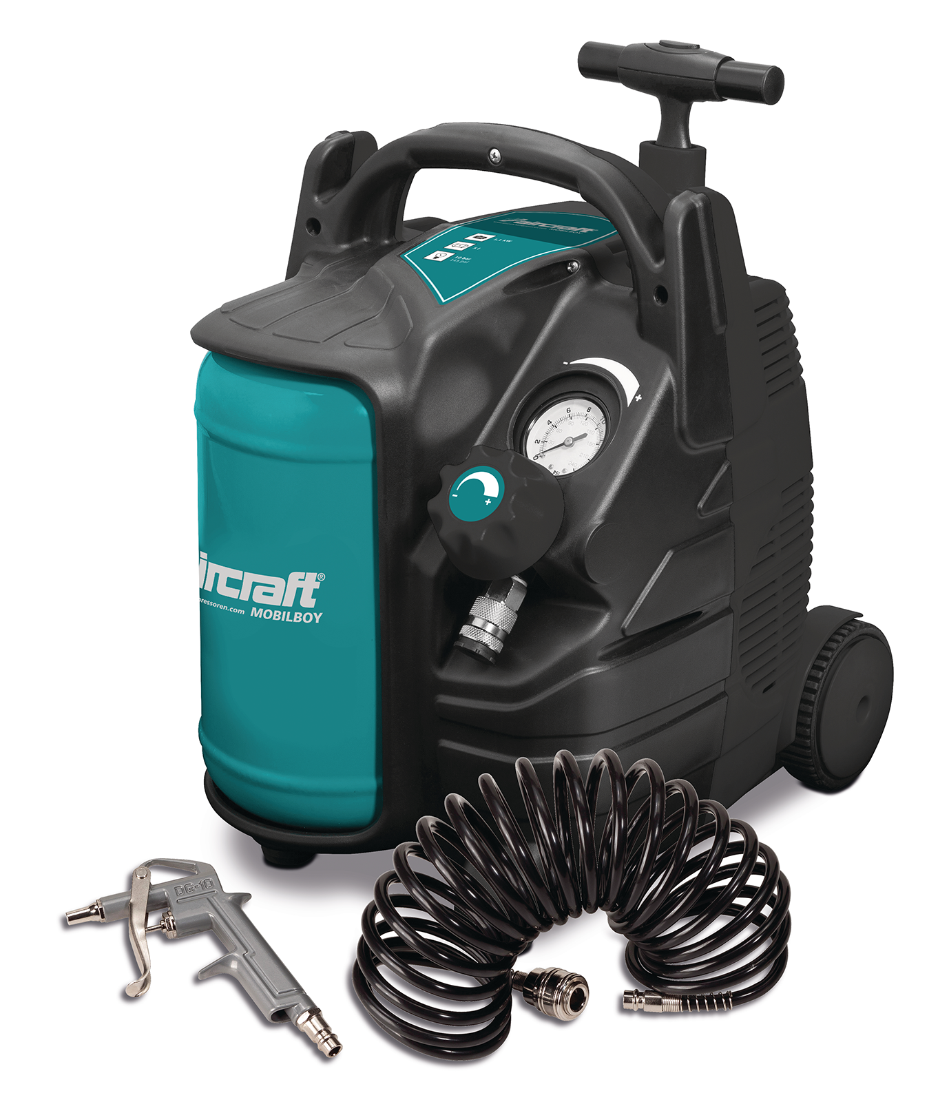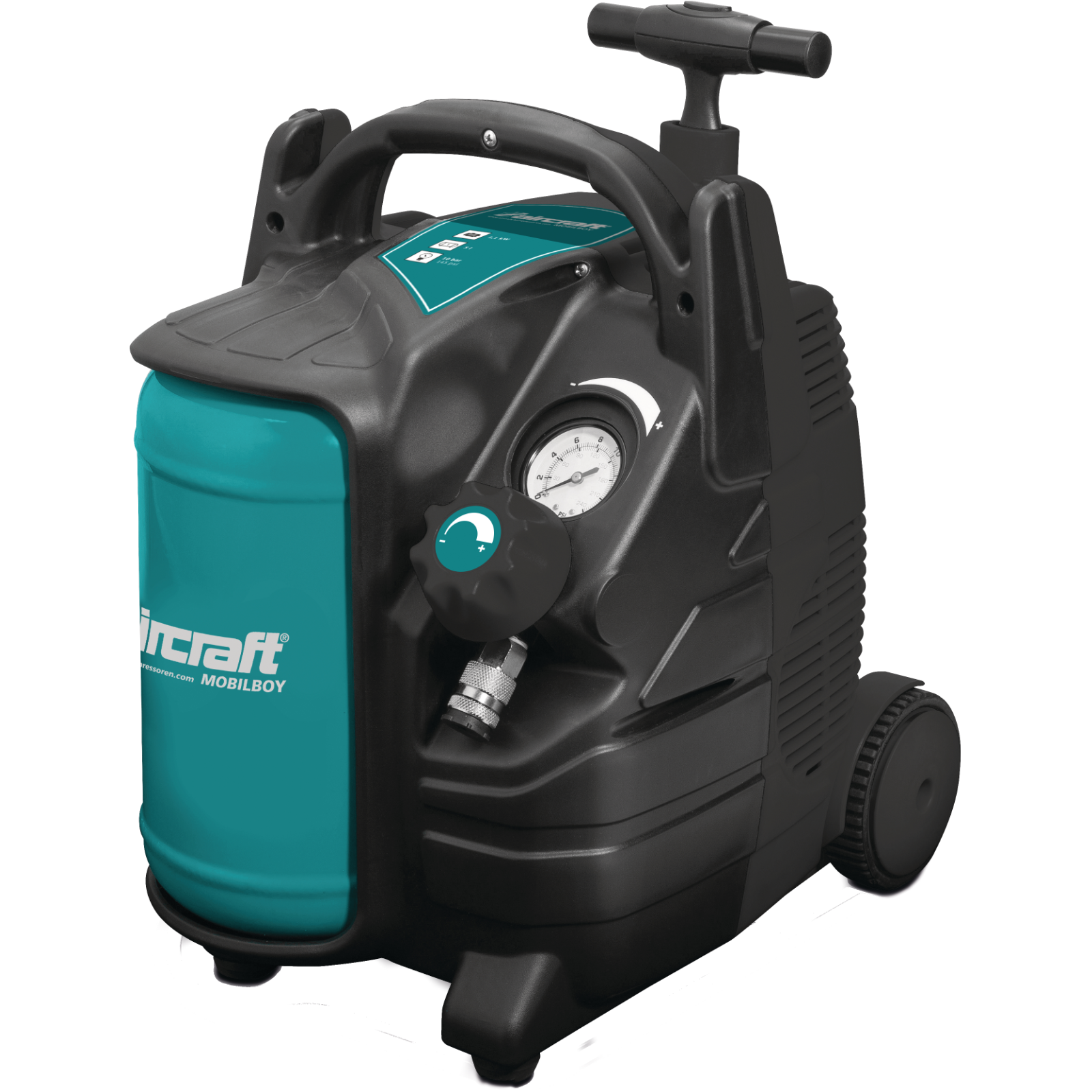 Handlicher Kompressor innovatives Design.Durch die kompakte Bauform, die stabilen Kunststoffräder, den ausziehbaren Griff und das geringe Gewicht (nur 12 kg) ist ein einfacher Transport möglich.Durch den ölfrei Verdichter kein Ölwechsel erforderlich. Leise laufender Verdichter mit max. 180 L/min Leistung und 8 bar Höchstdruck.Natürlich komplett mit Druckregler zur stufenlosen Einstellung der Arbeitsdrucks, Manometer und Einhand-Schnellkupplung.Idealer Kompressor für den mobilen Einsatz im Haus und Hobby-Bereich.