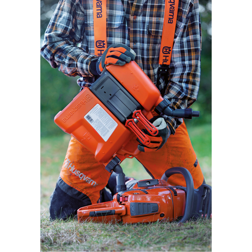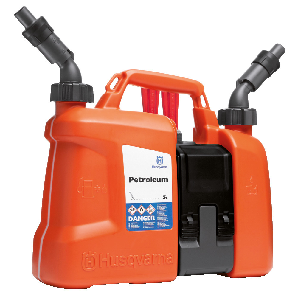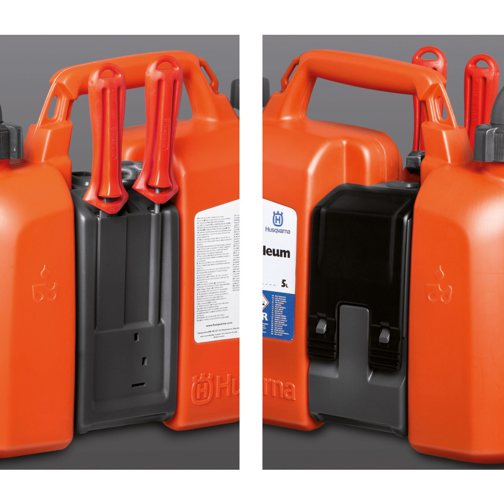 Neues Modell mit Füllstopp für Kraftstoff und integrierter Werkzeugbox, mit Sichtfenster für den Füllstand und platzsparender Transportstellung. Für 5 L Kraftstoff und 2,5 L Kettenöl (ohne Werkzeug).
