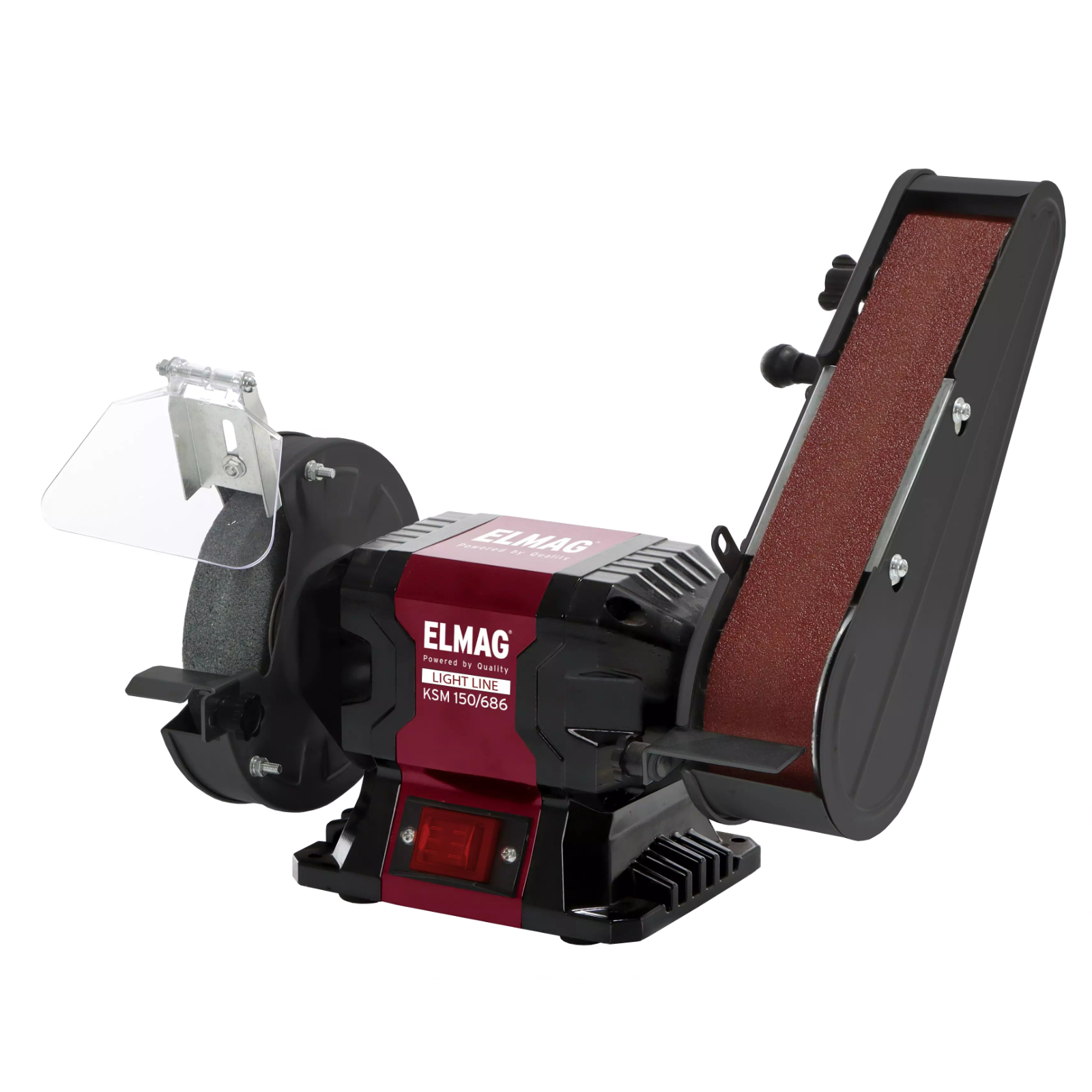 Hochwertiger Kombi-Werkstattschleifer mit 250 Watt / 230Volt, 2.980 U/min, Scheibendurchmesser 150/20mm, Schleifband 686/50mm, Eigengewicht ca. 7 kg.