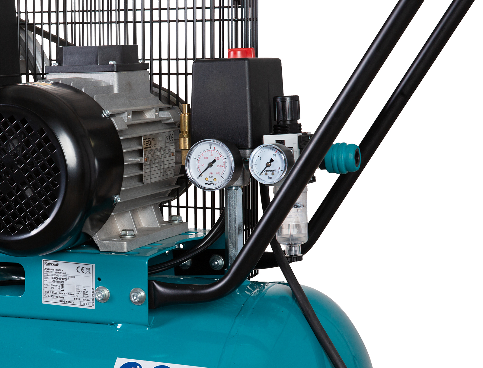 Kompakter Kompressor mit 2-Zylinder - 2-stufiges Hochleistungsaggregat mit ca. 620 L/min Ansaugleistung und der Füllleistung von 520 L/min ( bei 6 Bar)auch für anspruchsvolle DL - Werkezuge geeignet.Elektromotor mit 4,8 KW/6,5 PS bei 400 Volt. Langsame Verdichterdrehzahl von nur 950 U/min für leisen Lauf und lange Lebensdauer.Durch den kompakten 90 Kessel und das hochwertige Fahrwerk auch mobil einsetzbar.Sehr leistungsstarker Kompressor mit hochwertigen CONDOR -Druckschalter und Composite Sicherheitskupplung zum Aktionspreis.