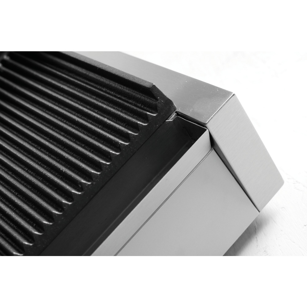 Hochwertiger Plattengrill. Gitter aus emailliertem Gusseisen. Rahmen aus Edelstahl. Mit Drahtbürste. Ausgestattet mit Fettschale und Aufkantung. Thermostat stufenlos regelbar bis max. 300°C, mit Kontrollleuchte, 230 V. Mit angehobener Oberseite (H) 530 mm. Grillfläche 340x230 mm