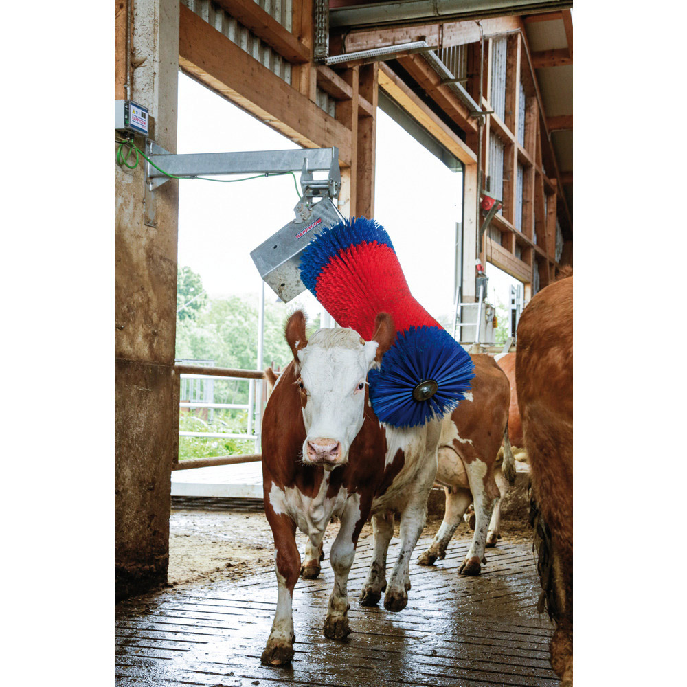 Die spezielle Anordnung der Bürste in vertikaler, pendelnder Form erleichtert die Reinigung des Fells von Kopf bis Rumpf. Die Bürste ist von allen Seiten zugänglich und dreht sich in jede Richtung und beinahe jeden Winkel, womit jede Körperstelle des Tieres erreicht wird. Des weiteren gibt es auch das Problem des Aufspringens, wie bei horizontal ausgelegten Bürsten nicht!Geeignet für das AMA-Gütesiegel Tierhaltung plus Die Kuhputzmaschine kann auch im Außenbereich (z. B. im Laufhof) montiert werden. Hier ist allerdings zu beachten, dass das Gerät durch ein Dach gegen zu starke Sonneneinstrahlung, Regen und Schnee geschützt sein muss!!!