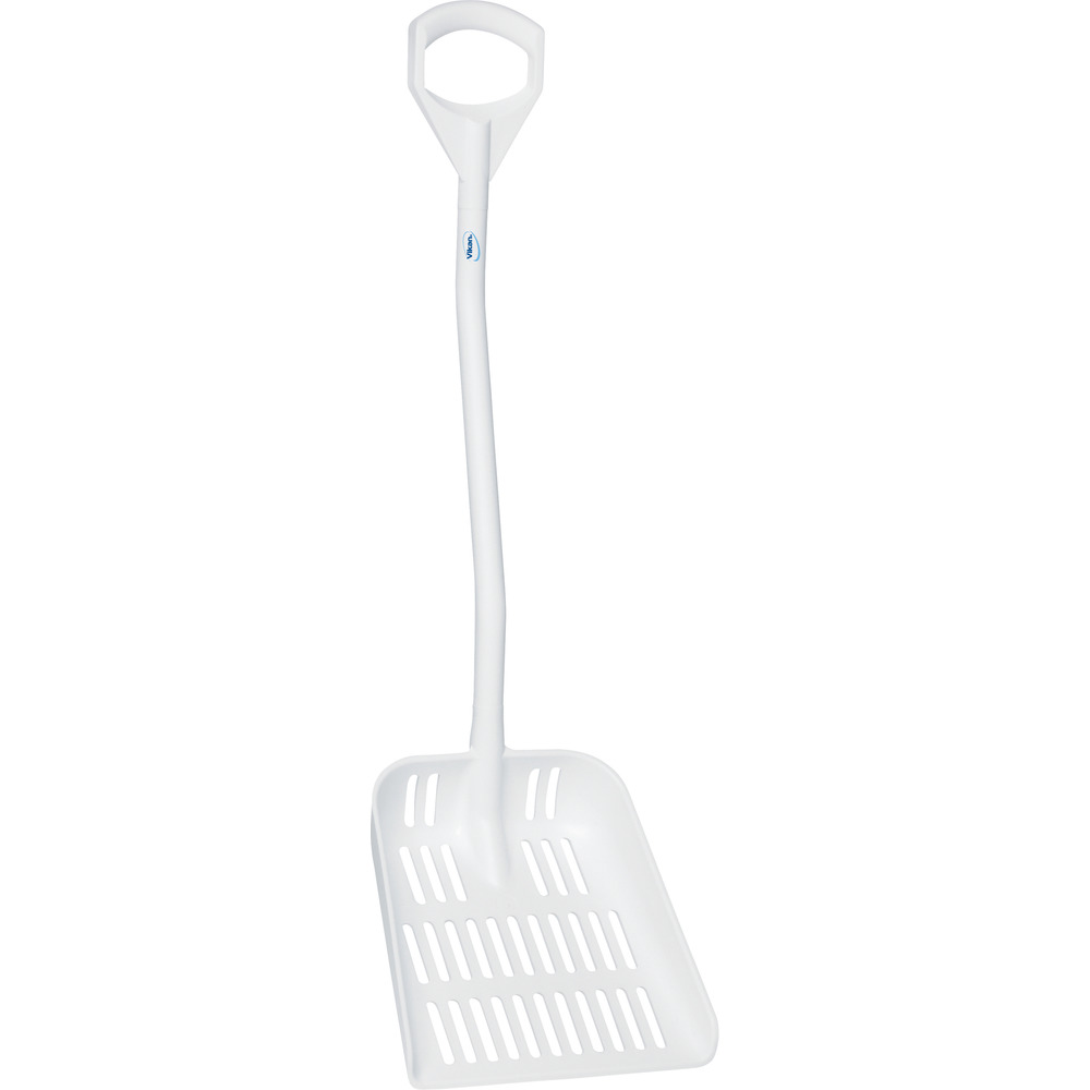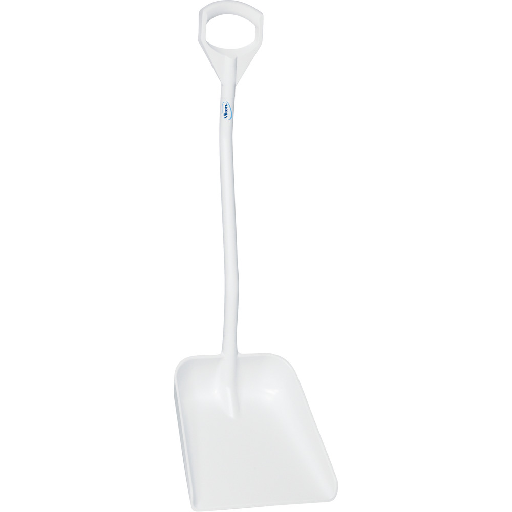 Ergonomische weiße Schaufel aus Polypropylen (PP). Lebensmittelecht. D-Griff-Stiel mit Aluminiumkern 1150 mm lang. Schaufelblatt 380 x 340 mm (LxB). Hervorragend geeignet z. B. als Maischeschaufel.