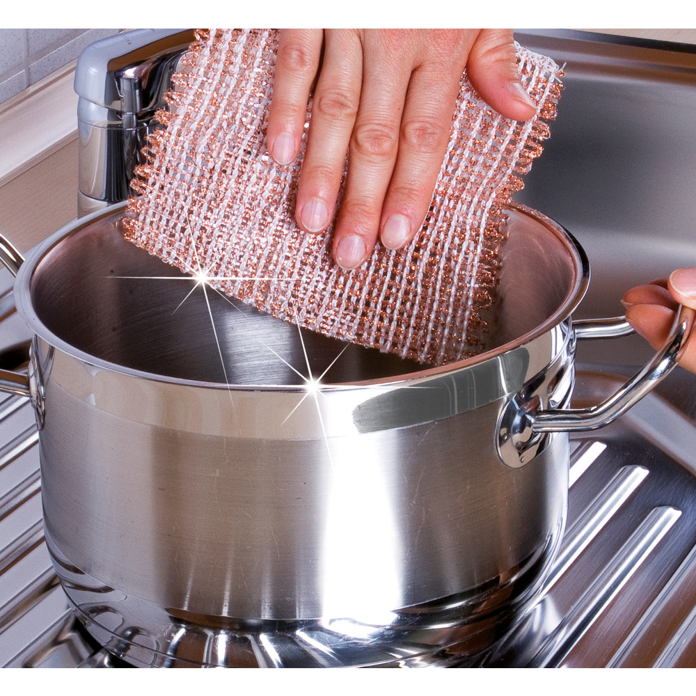 Universal einsetzbares Kupfertuch, entfernt selbst hartnäckigen Schmutz wie Eingebranntes oder Rost, jedoch ohne die Oberflächen zu zerkratzen. Besonders langlebig.6 Stück per Pkg. 14 x 14 cm