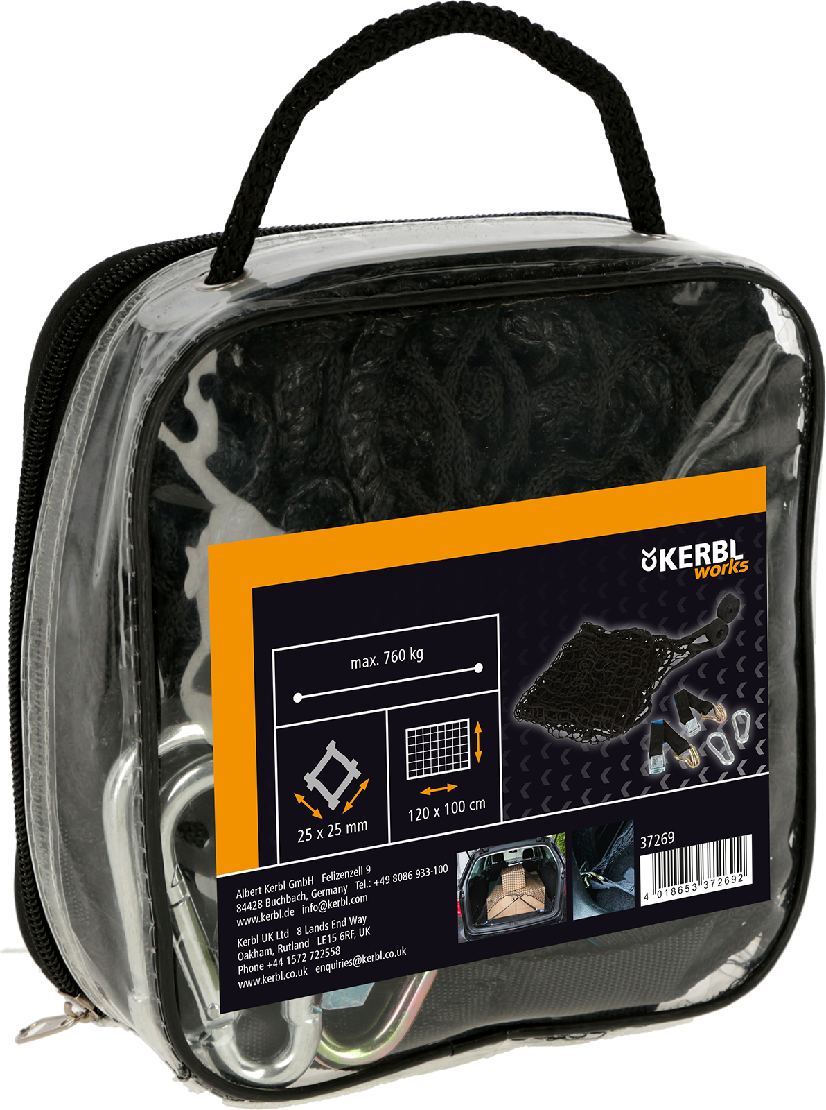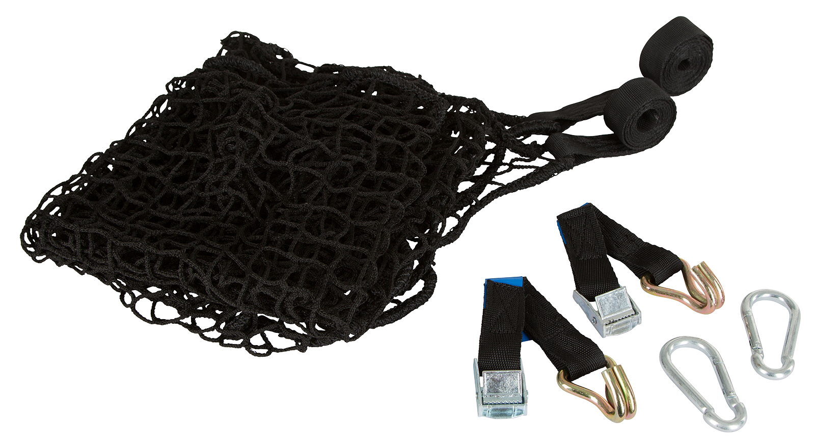 Lieferumfang: 1 Netz 100x120 cm (Maschenweite 25x25 mm), 2 Karabinerhaken, 2 Gurte.Das eine Gurtende wird an den PES-Zugbändern des Netzes mittels Klemmschlösser befestigt, das andere Gurtende mittels Spitzhaken an Ankerpunkten des Fahrzeugs
