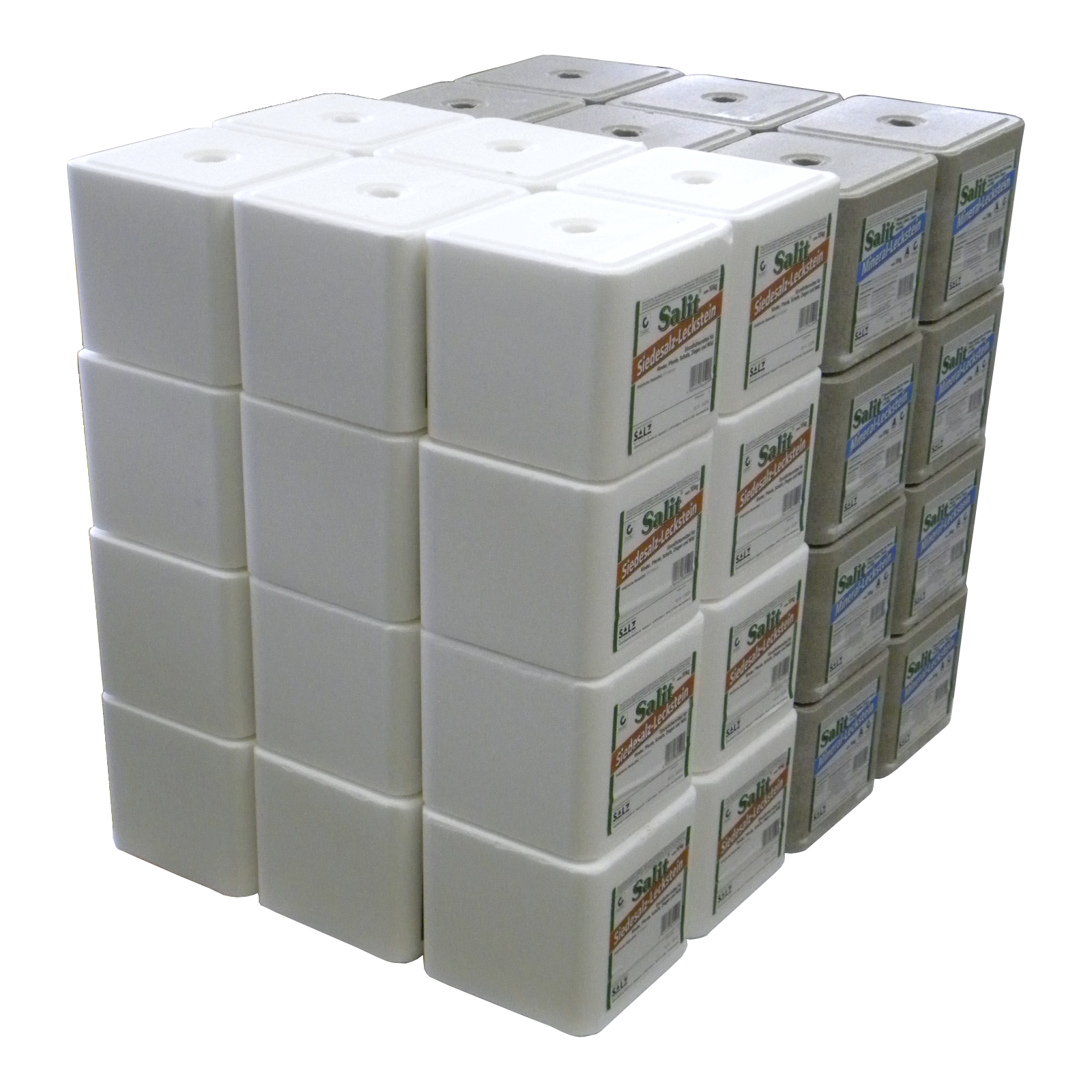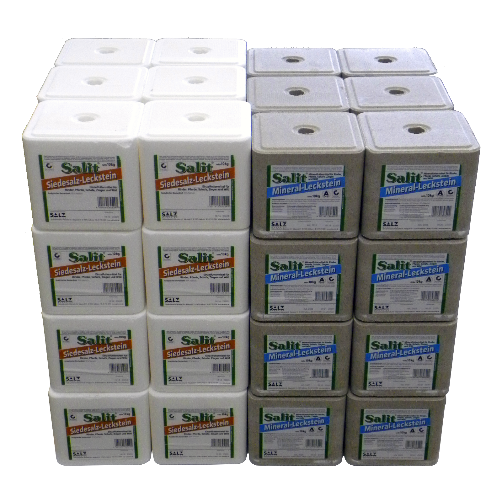 bestehend aus je 24 Salz-Lecksteine 10 kg und 24 Mineral-Lecksteine 10 kg. Geeignet für Rinder, Pferde, Schafe und Ziegen. In der ökologischen Produktion gemäß EG-Verordnung zu verwenden. Speditions-Lieferung auf Einwegpalette 80 x 60 cm.