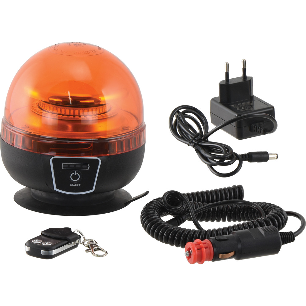 Wiederaufladbar Kennleuchte mit 45 LED´s, 3 Blinkmuster, starke magnetische Halterung, 4-stufige Akkuanzeige (100 %, 75 %, 50 %, 25 %), Fernbedienung als Schlüsselanhänger zum Ein-/Ausschalten, Ø 128mm, Höhe 128mm, 12/24V, 6-15 Watt, IP65, EMC/ECE, Temperaturbereicht -30/+50°C, Betriebszeit 5 Stunden, inkl. Ladekabel für 230V und 12V/24V