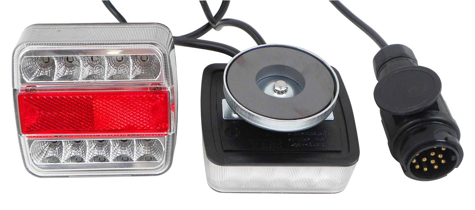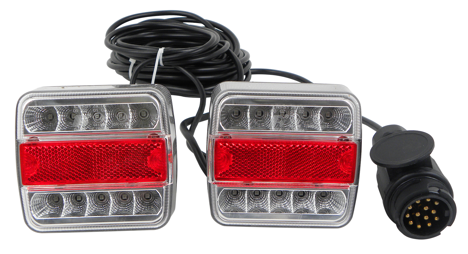 LED Vierfunktionslicht Set, mit 2 Stk. (Blinker, Rücklicht, Bremslicht, Kennzeichenlicht)2 x 5 LED Reihen (Kennzeichen = 4 LED's), in Klarglasoptik, Gehäuse wasserdicht verschweißt,Maße ca. BxHxT: 105x100x35 mm, 12 V,rechts- und linksseitig verwendbar, mit 2,5m Zwischenkabel und 7,5m Anschlusskabel,13 pol. Stecker, Magnethalter, Belegung nach ISO 11446 (nicht für 7polige Systeme verwendbar)