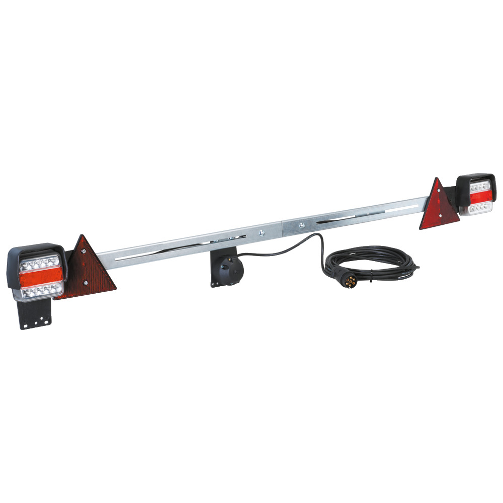 mit Steckdose, ausziehbar, komplett verkabelt mit 7-poligem Stecker und Steckdose, Kabellänge 7,50 m, 2 Dreieckrückstrahler, inkl. Kennzeichenhalterung, mit Schlagschutz.