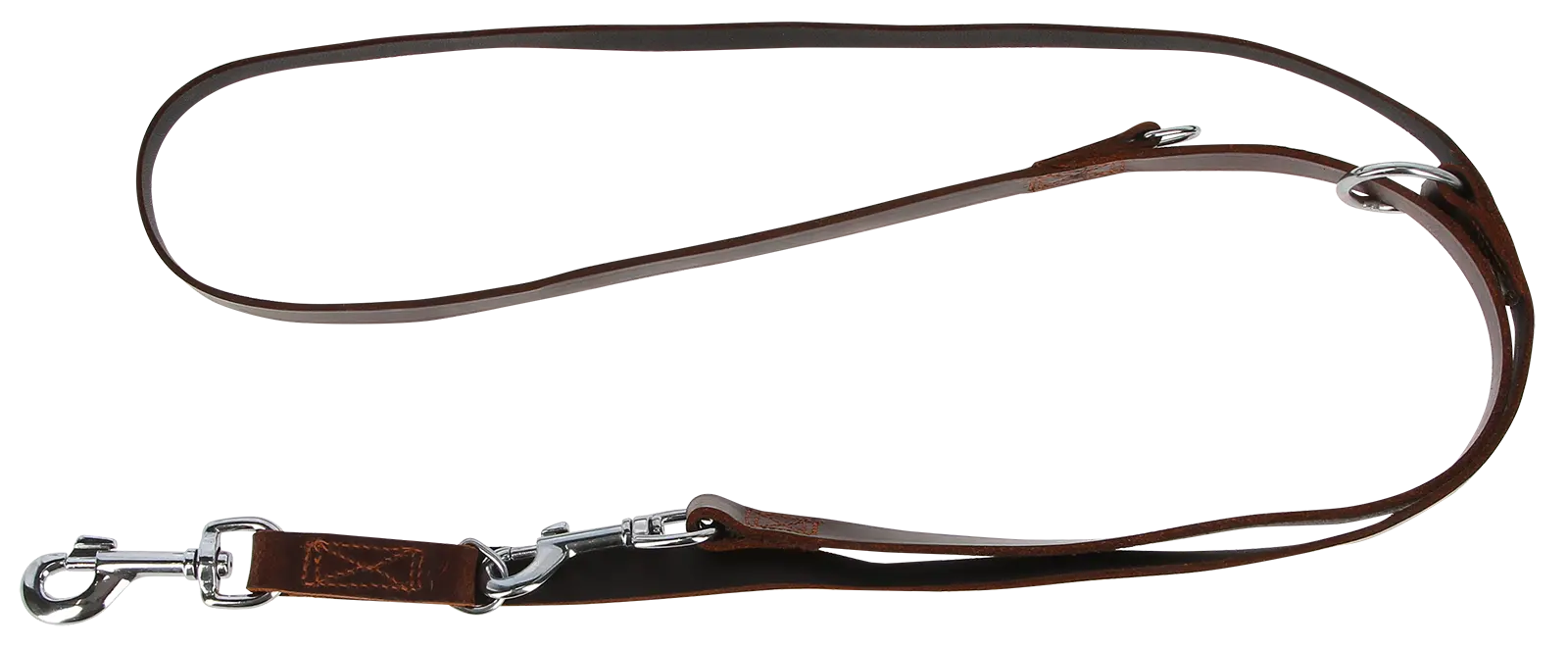 Hochwertiges, braunes Qualitätsleder. Mit stabilen und verchromten Beschlägen und Verschlüssen. Genäht. L x B: 2 m x 18 mm