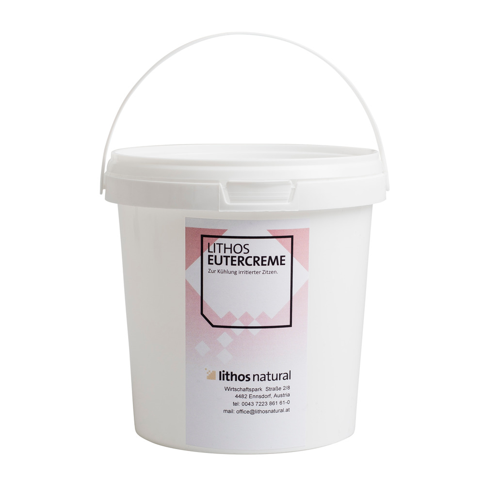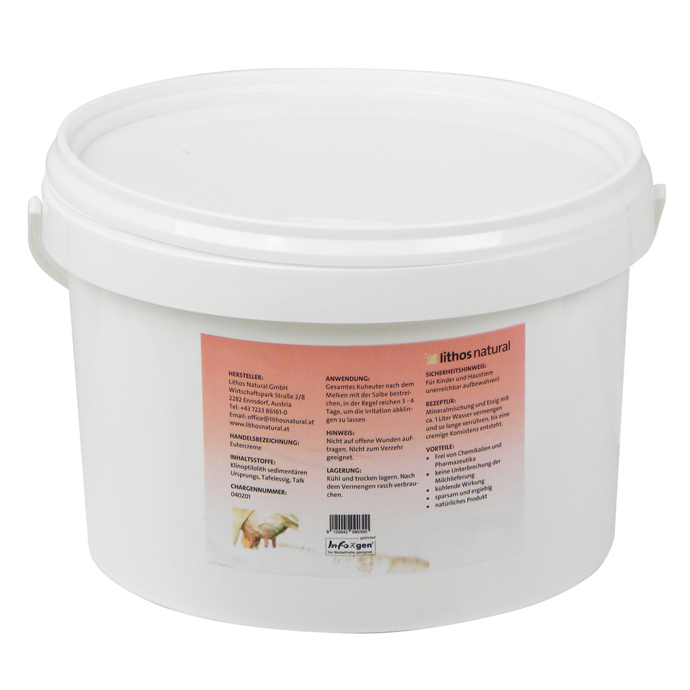 Zur Kühlung irritierter Euter.Lithos Eutercreme ist die Weiterentwicklung des bekannten Naturheilmittels ″essigsaure Tonerde″.Der verwendete Zeolith übernimmt die Funktion eines Schadstoffbinders (Amoniakbindung).Durch den sauren pH-Wert kann Lithos Euterceme effektiv Mikroorganismen beseitigen.Die Salbe verfügt über einen kühlenden Effekt und kann auf das Euter aufgetragen werden.Lithos Eutercreme ist frei von Pharmazeutika und chemischen Wirkstoffen, daher entstehen keine Wartezeiten bei der Milchproduktion.Für Bio-Betriebe geeignet.Rezeptur: Mineralmischung (Komponente 1) und Essig (Komponente 2) mit Wasser vermengen und so lange verrühren bis eine cremige Konsistenz erreicht ist.Da es sich um ein reines Naturprodukt ohne Konservierungsstoffe handelt, sollte die Menge nur nach Bedarf abgemischtund die Creme nach dem Vermengen unverzüglich verbraucht werden. Anwendung: Gesamtes Kuheuter nach dem Melken bestreichen, in der Regel reichen 3-4Tage um die Irritation abklingen zu lassen.Ein 4 kg Kübel reicht für 8 bis 11 Anwendungen.Anwendungshinweise: LithosEutercreme verfügt über eine kühlende und pflegende Wirkung.Äußerlich eincremen und gut einmassieren.Nach der Anwendung die trockene Creme abbürsten oder das Euter mit Wasser reinigen. Die abgefallene trockene Creme dient im Stall als Einstreuzusatz und bindet dort Schadstoffe.