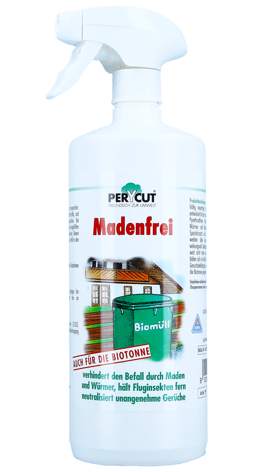 Madenfrei 299 ist ein neu entwickeltes, besonders wirksames Mittel zur Behandlung von Biomülltonnen.Es kommt ganz ohne Pyrethroide aus und bekämpft zuverlässig Maden und Würmer.Ein spezieller Zusatz hält zusätzlich Fliegen und andere Insekten fern.Gleichzeitig werden unangenehme Gerüche durch einen Geruchsneutralisator deutlich reduziert – für saubere Tonnen und ein angenehmeres Umfeld.Anwendung:Biomüll-Behälter entleeren und mit Wasser auswaschen. Anschließend Wände und Boden gleichmäßig und vollständig mit Madenfrei 299 einsprühen. Bei Befüllung mit Bio-Müll die Oberseite des frisch eingefüllten Abfalls intensiv und flächendeckend einsprühen. Diesen Vorgang unbedingt, bei jedem Einfüllen von Müll in den Behälter, wiederholen.Der behandelte Biomüll-Behälter wird nicht mehr von Fluginsekten umschwärmt,es bilden sich im Müll keine Maden und Würmer und die Geruchsbelästigung wird ebenfalls beseitigt.Perycut Madenfrei vorsichtig verwenden. Vor Gebrauch stets Kennzeichnung und Produktinformation lesen.BAuA-Registriernummer : N-107142Inhalt: 1 Liter