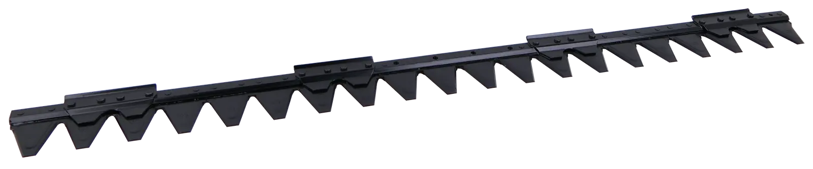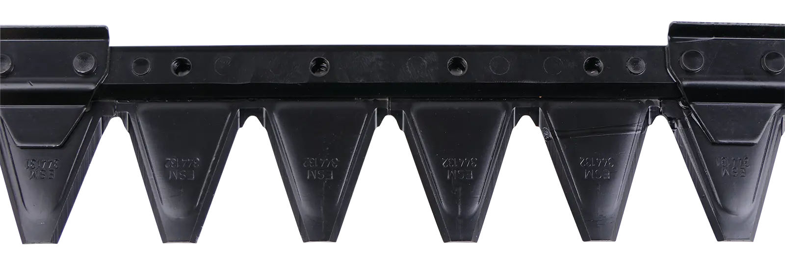 Mähmesser mit 20 Klingen passend zu ESM Universal-C Mähbalken. Der Messerkopf wird je nach Ausführung mit 2 M8 oder mit 4 M8 Schrauben im Abstand von 50,9 mm und 152,7 mm auf dem Messer befestigt. Auf dem Mähmesser sind 4 Stk. Führungsleisten über der 2./3., 7./8., 13./14. und 18./19. Klinge angebracht. Im Bereich der Messerkopfaufnahme sind die Nieten verschliffen.
