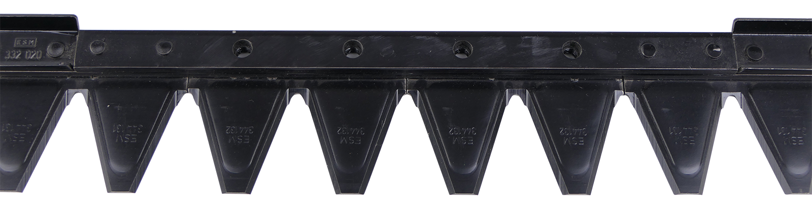 Mähmesser mit 20 Klingen passend zu ESM Universal-SC Mähbalken. Der Messerkopf wird je nach Ausführung mit 2 M8 oder mit 4 M8 Schrauben im Abstand von 51 mm und 153 mm auf dem Messer befestigt. Auf dem Mähmesser sind 4 Stk. Führungsleisten über der 1./2., 6./7., 14./15. und 19./20. Klinge angebracht. Im Bereich der Messerkopfaufnahme ist eine Verstärkungsleiste mit einer Stärke von 5 mm montiert.
