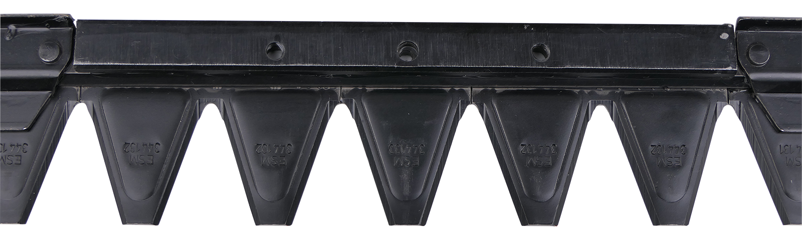 Mähmesser mit 23 Klingen passend zu ESM Universal-S Mähbalken. Der Messerkopf wird mit 2 M8 Schrauben im Abstand von 101,6 mm auf dem Messer befestigt. Auf dem Mähmesser sind 4 Stk. Führungsleisten über der 2./3., 8./9., 15./16. und 21./22. Klinge angebracht. Im Bereich der Messerkopfaufnahme ist eine Verstärkungsleiste mit einer Stärke von 6 mm montiert. In der Mitte der Verstärkungsleiste ist eine Bohrung mit 8 mm Durchmesser zur Aufnahme einer Zentrierung.