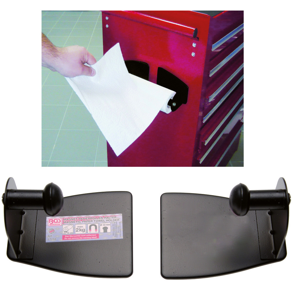 Praktischer Papier Rollenhalter zwei teilig. Wird mit Magneten an jeder beliebigen magnetischen Oberfläche montiert, dadurch universell einsetzbar (zB. Werkzeugwagen, Werkbank, Flügeltürschrank,…) Die Kapazität des Halters liegt bei 30 kg, die Rollenaufnahme beträgt Ø 33 mm.