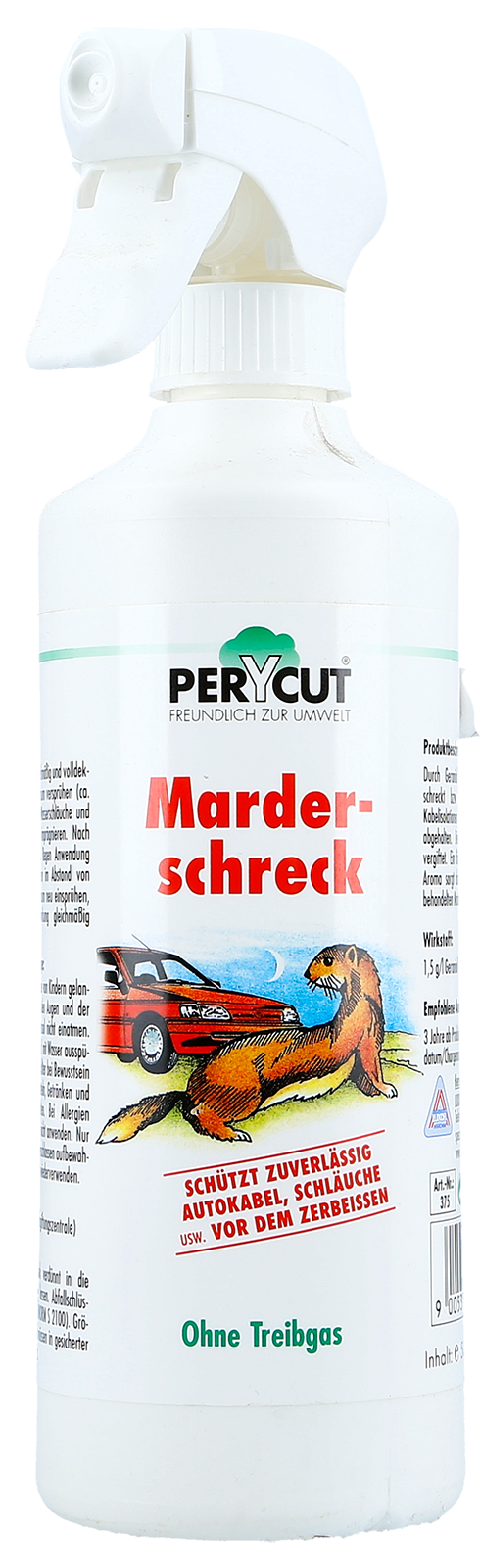 Der Marderschreck schützt Fahrzeuge und Geräte zuverlässig vor Marderschäden.Bittere Pflanzenextrakte schrecken die Tiere ab und verhindern, dass sie Kabelisolierungen oder Kunststoffschläuche anknabbern.So bleiben Leitungen und Schläuche unbeschädigt.Anwendung:Marderschreck 375 gleichmäßig im Motorraum versprühen, speziell Wasserschläuche und Kabelisolationen gut imprägnieren.Nach längeren Fahrten im Regen Anwendung wiederholen, ansonsten im Abstand von 3-4 Wochen Motorraum neu einsprühen,damit die Schutzwirkung gleichmäßig erhalten bleibt.Die Marder werden nicht vergiftet, sondern durch den eingearbeiteten Bitterextrakt am Kauen der imprägnierten Teile gehindert.Gleichzeitig sorgt ein für Marder unangenehmes Aroma dafür, daß die Tiere den behandelten Motorraum meiden.Marderschreck vorsichtig verwenden, vor der Verwendung stets Etikett und Produktinformation lesen.Inhalt: 0,5 LiterBAUARegistriernummer: 76610
