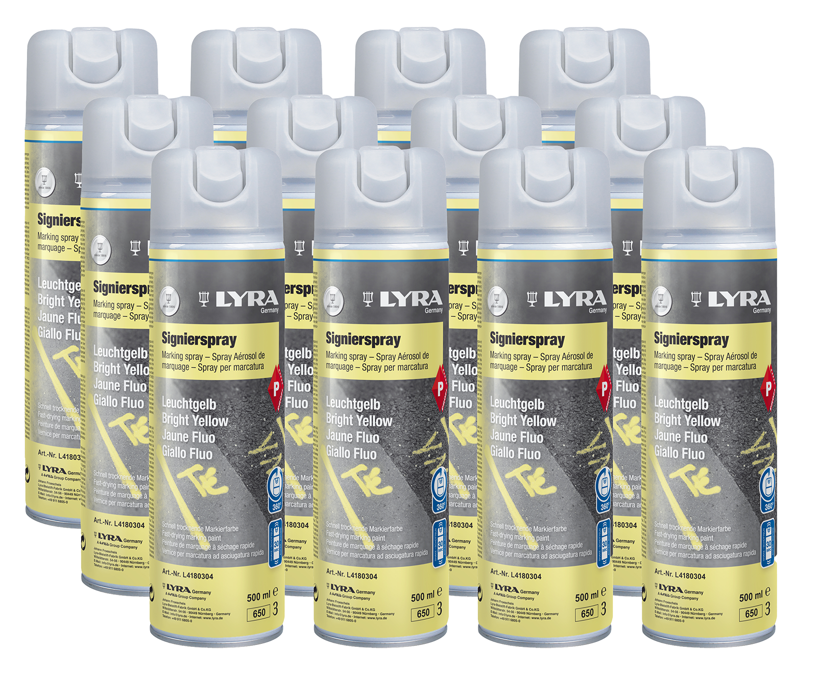 12er SET Spraydosen Signal-gelbProfi Qualität.Mit Schreibsprühkopf 500 mlzum Anzeichnen und Beschriften von Holz, Steinen usw.schnelltrocknend, hohe Deckkraft.