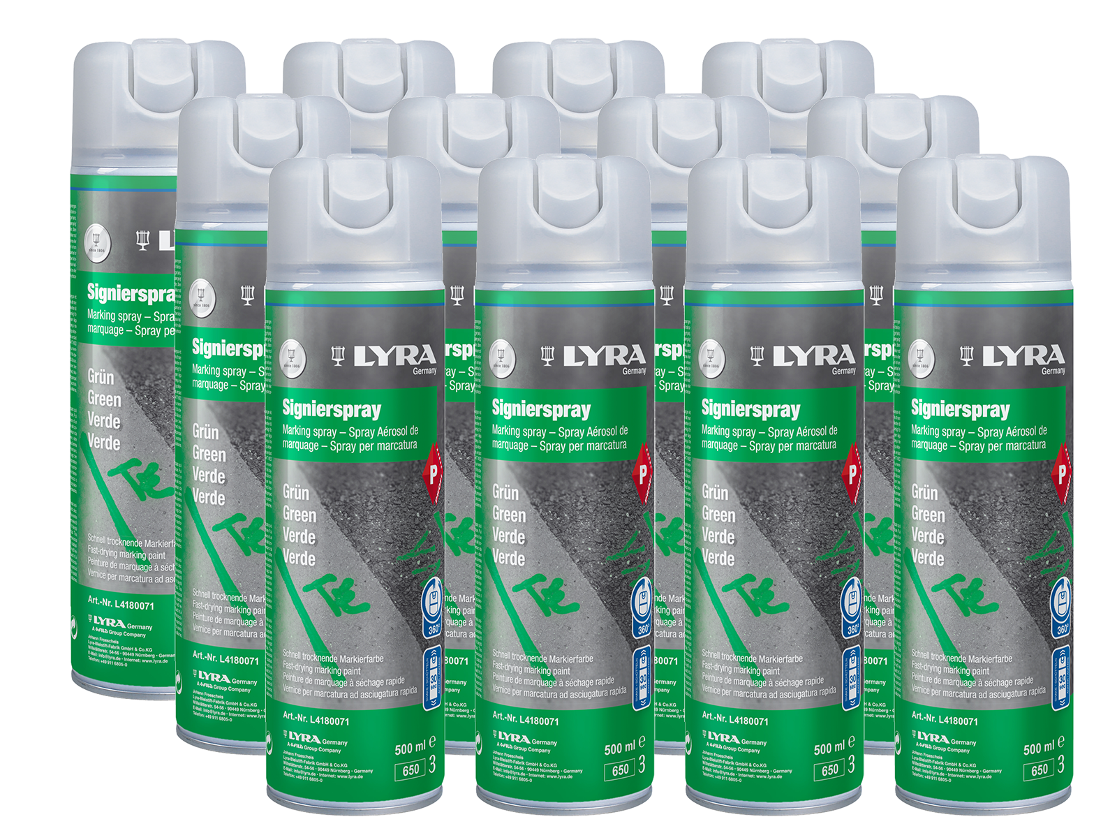 12er SET Spraydosen grünProfi Qualität.Mit Schreibsprühkopf 500 mlzum Anzeichnen und Beschriften von Holz, Steinen usw.schnelltrocknend, hohe Deckkraft.