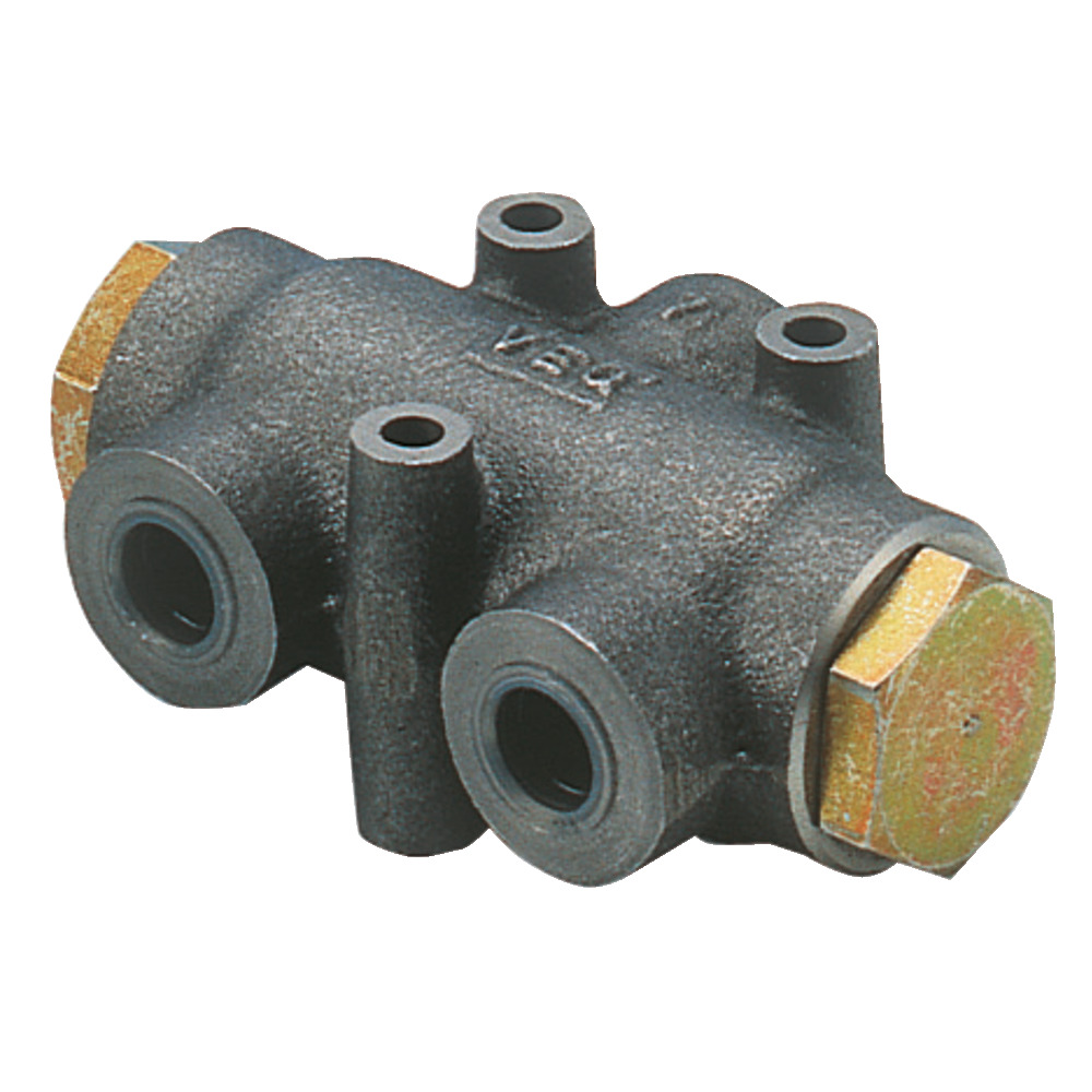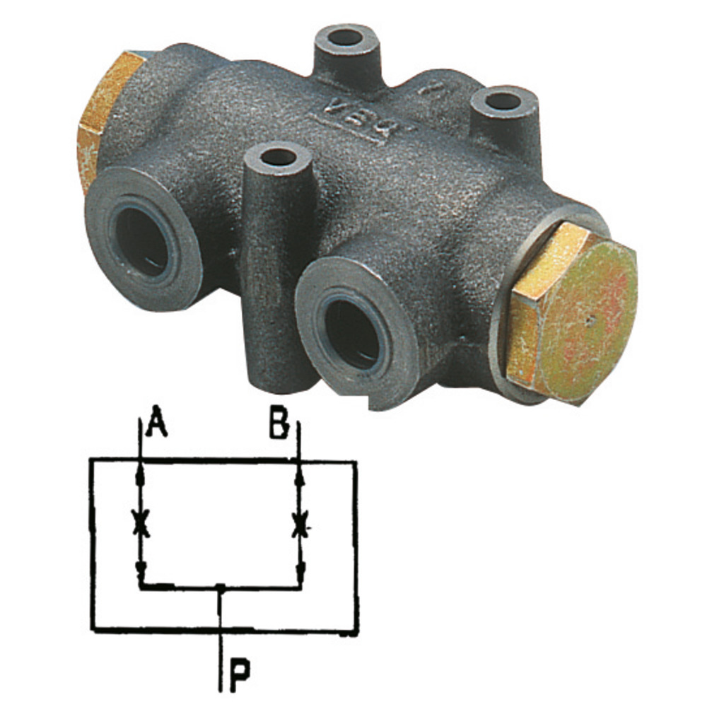 Teilverhältnis 1:1. Der eingehende Ölstrom wird in 2 gleich große Teilmengen aufgeteilt unabhängig vom Betriebsdruck. Bei Änderung der Durchflussrichtung werden die Teilströme wieder addiert. Z.B. für Silozange mit 2 Zylindern. Durch ungleichmäßige Befüllung der Silozange werden die Zylinder unterschiedlich beansprucht. Mit dem Mengenteiler kann dies verhindert werden.
