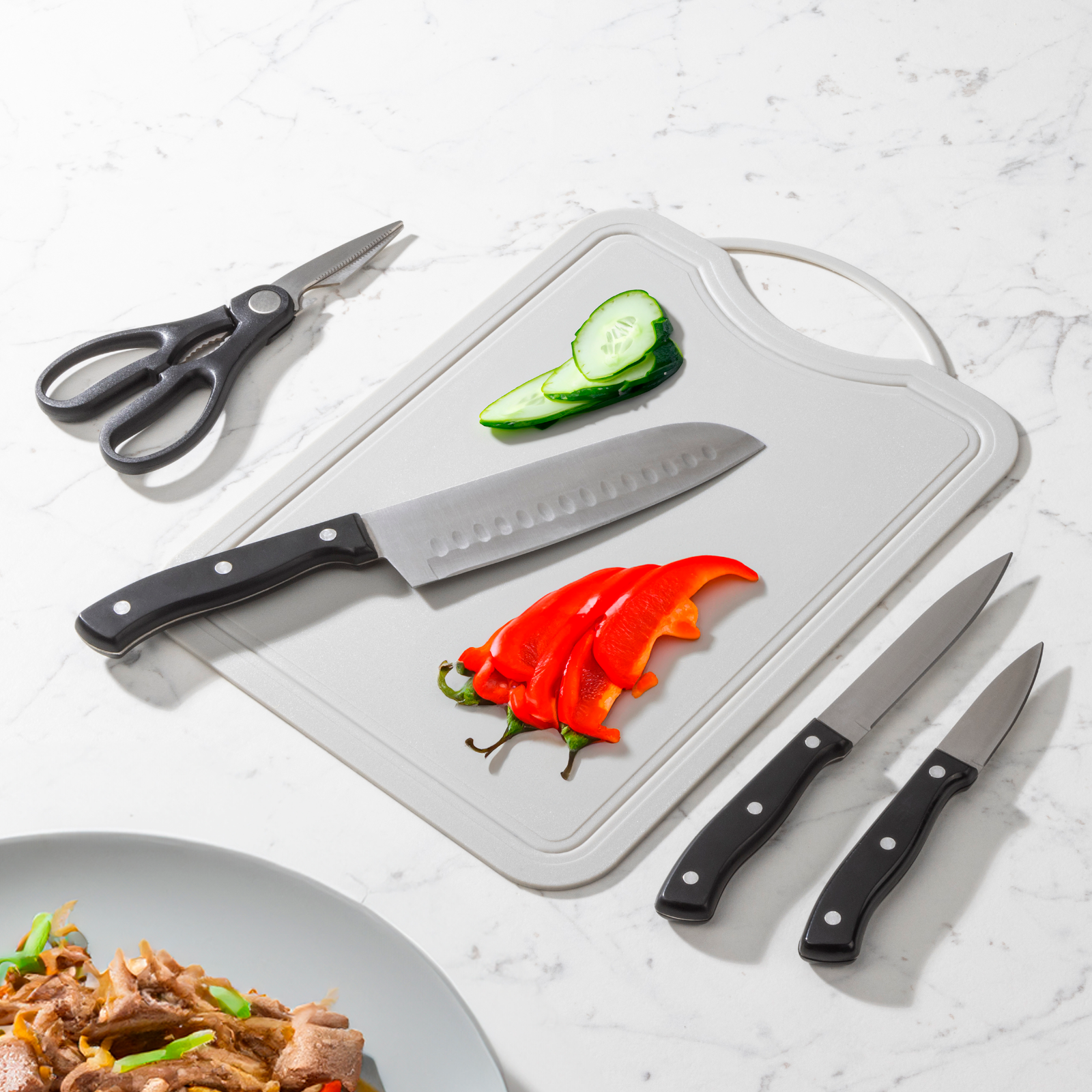 Das 5-teilige Messer Set mit Schneidebrett ist der ideale Küchenhelfer für alle Schneidearbeiten.Es enthält 3 hochwertige Messer und eine Küchenschere für verschiedene Aufgaben – vom Schneiden von Fleisch und Gemüse bis hin zum Schälen von Obst.Die scharfen Edelstahlklingen sorgen für präzises Arbeiten und sind langlebig sowie rostbeständig.Das mitgelieferte Schneidebrett schützt Ihre Arbeitsfläche und bietet eine hygienische Basis zum Zubereiten Ihrer Speisen.Dieses Set ist perfekt für Hobbyköche und Profis, die Wert auf Qualität und Komfort in der Küche legenBestehend aus: