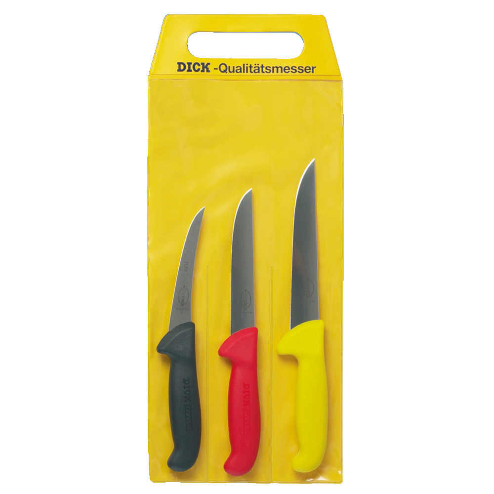 1 Ausbeinmesser geschweift flexibel 13 cm, 1 Ausbeinmesser gerade 15 cm, 1 Steckmesser 18 cm.