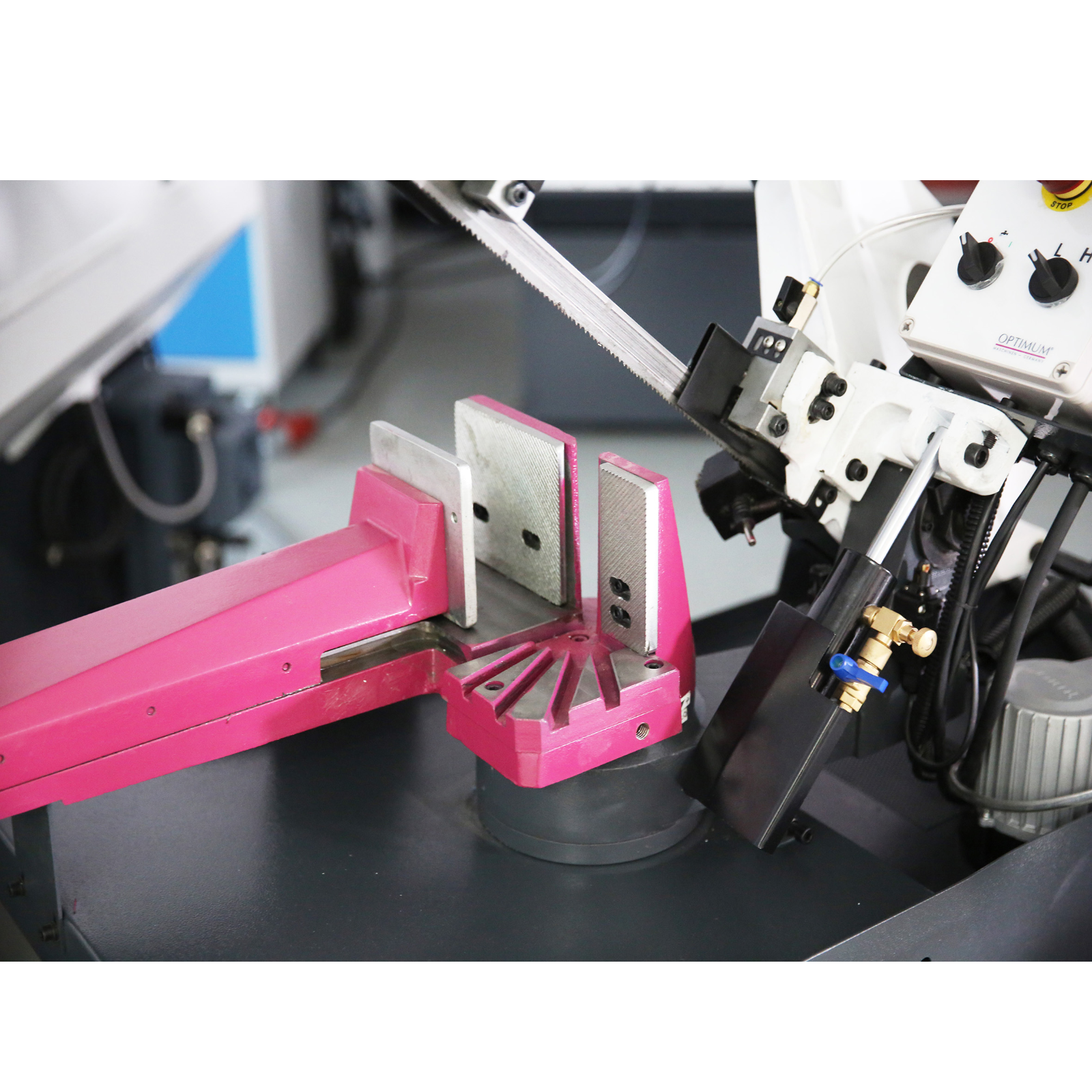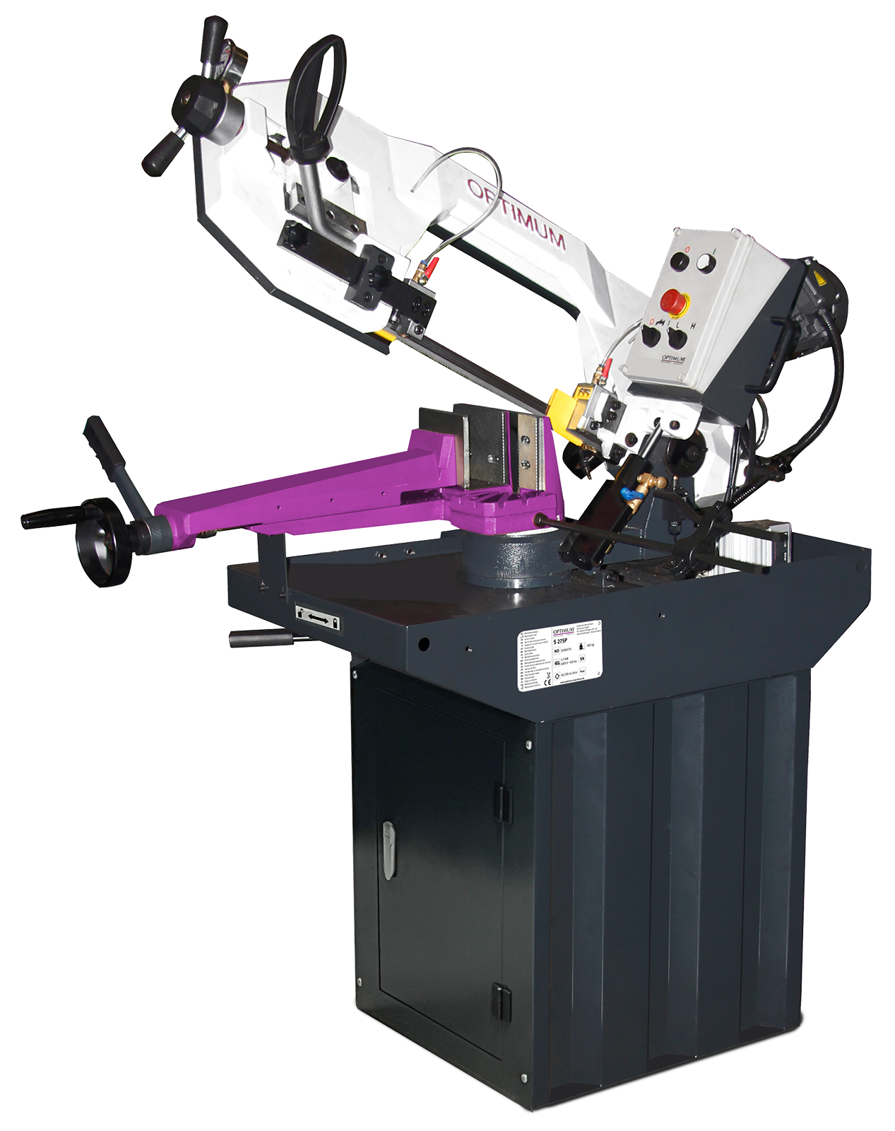 Stabile Metallsäge mit hoher Schnittgenauigkeit und großem Schnittbereich. Schnittdruckeinstellung über HY-Zylinder. Sägeblattspannung über Manometer exakt einstellbar. Automatische Endabschaltung nach Schnittende. Durch den Antrieb über ein 2-stufiges Getriebe sekundenschnelles umschalten der Schnittgeschwindigkeit und kein Rutschen oder Verschleiß von Keilriemen. Komplett mit Untergestell inkl. Tür und Ablage, Kühlmittelpumpe, schwenkbarem Sägebügel und Bi-Metall Sägeblatt.