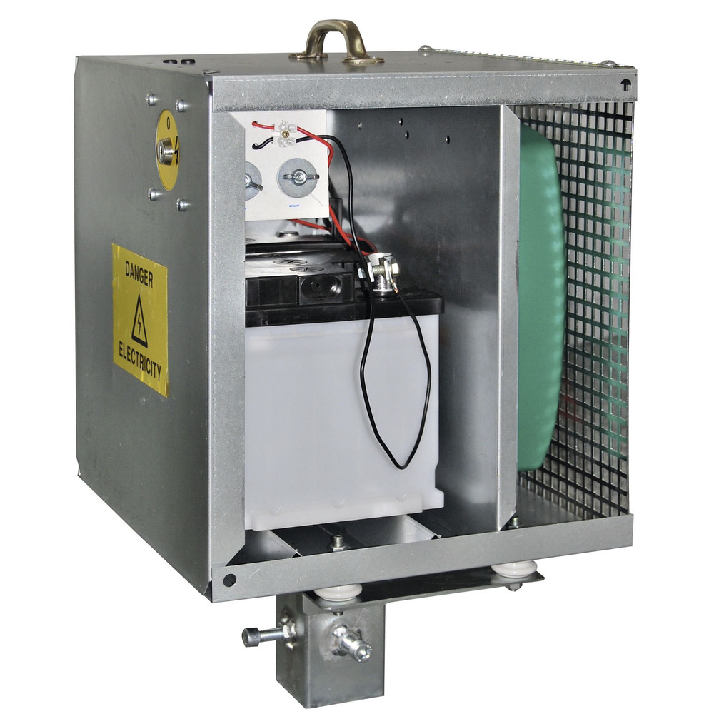 Elektrifizierbarer Metallkasten für Weidezaungeräte aus verzinktem Stahl. Anti-Diebstahlkasten ist abschließbar, das Schloss ist im Lieferumfang enthalten. Inkl. massivem 80 cm langem Montage-/Erdpfahl.Außenmaße (B x T x H): 37,5 x 33,5 x 37,5 cmPlatz für Akkugerät max. 36,5 x 11 x 37 cmPlatz für 12 V Akku max. 36,5 x 21,5 x 21 cmLieferung ohne Gerät und Akku!